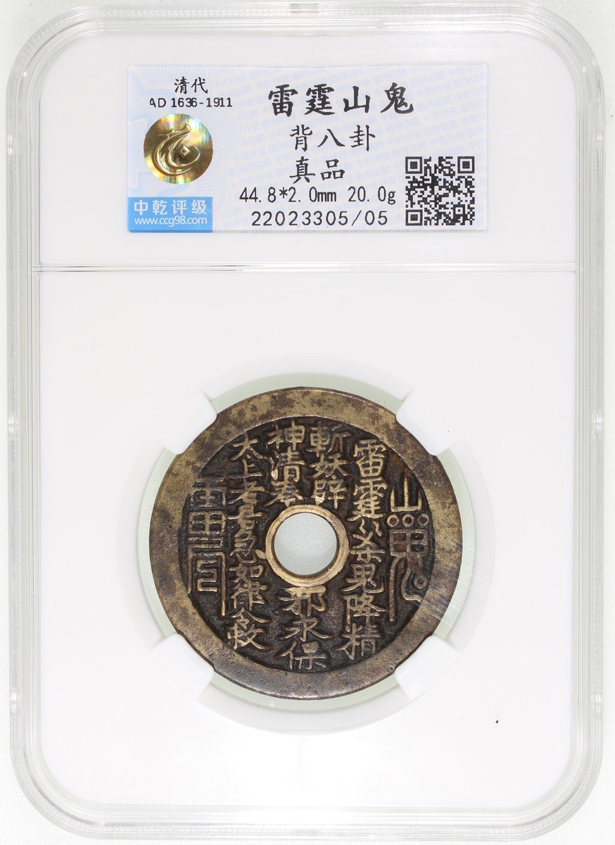 蘇爐山鬼雷霆咒圓穿花錢,背八卦,清朝(公元1644–1911),44.8*2.0mm,重20.0g,中乾真品。品相極美,好品。