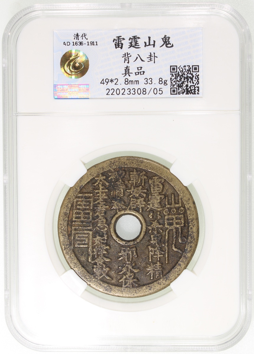 蘇爐山鬼雷霆咒圓穿花錢,背八卦,清朝(公元1644–1911),49*2.8mm,重33.8g,中乾真品。品相極美,好品。