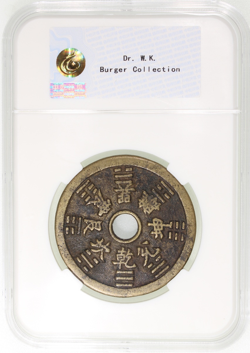 China: Qing Dynasty (1644-1911 CE), coin-like charm with round hole, Jiangsu mint production, obverse inscribed Taoist incantation, reverse inscribed Bagua signs and their corresponding characters, 49*2.8mm, 33.8g, Zhong Qian Genuine. Extremely fine, a beautiful example.