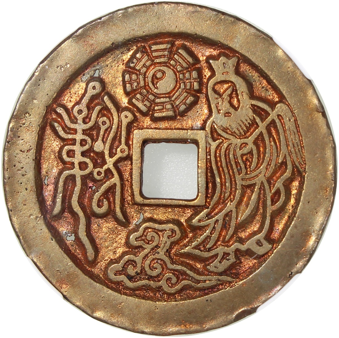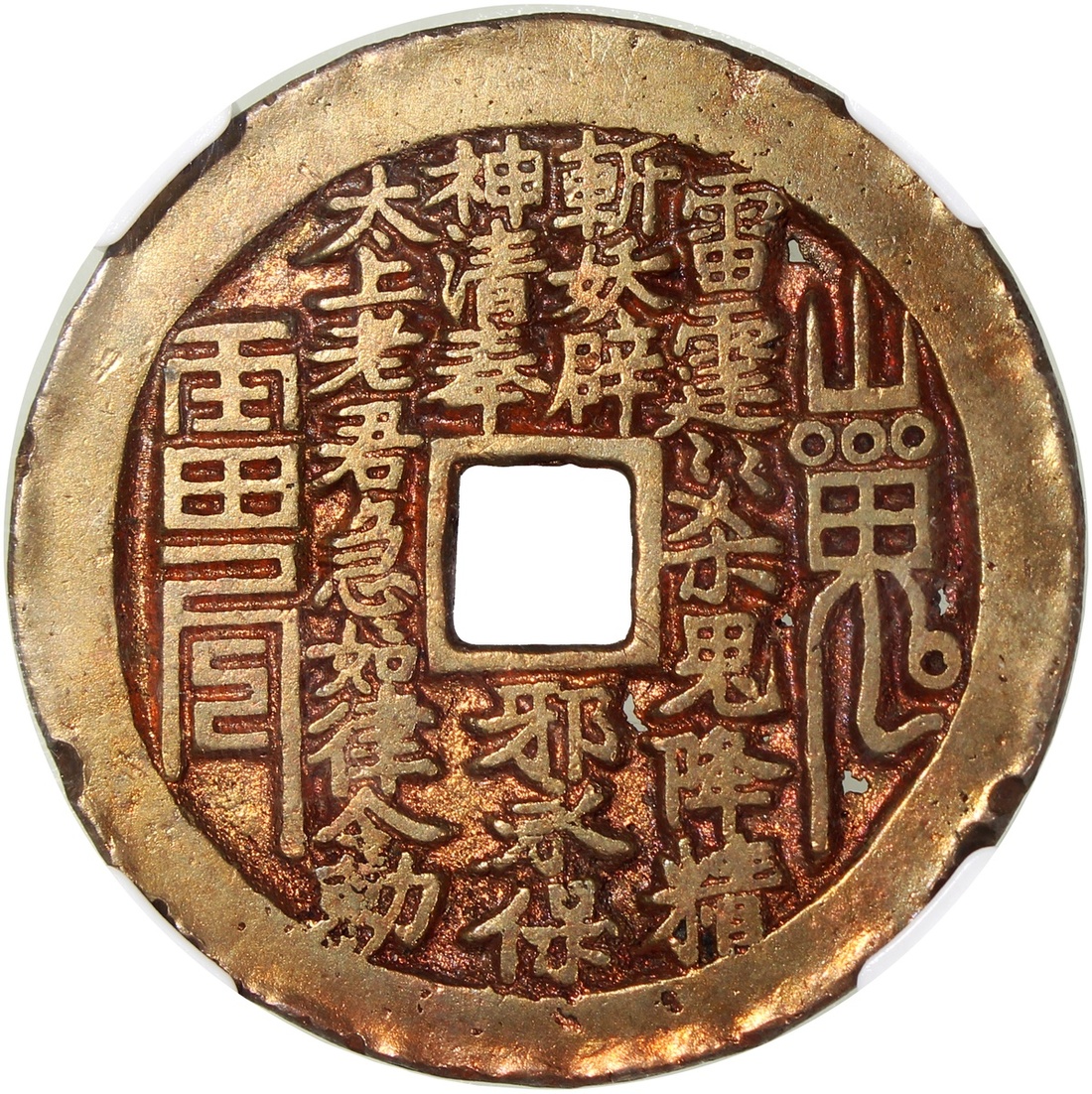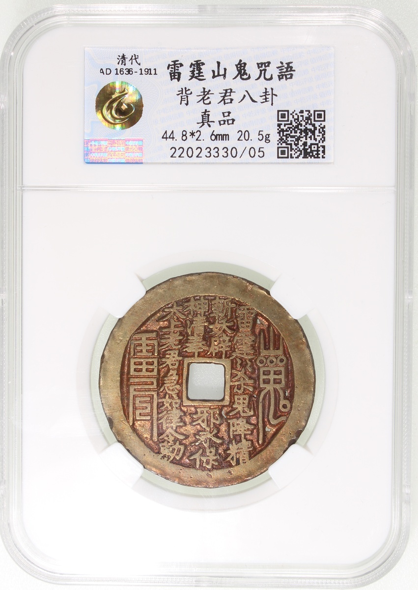 山鬼雷霆咒方穿花錢,背老君八卦,清朝(公元1644–1911),44.8*2.6mm,重20.5g,中乾真品。品相極美。