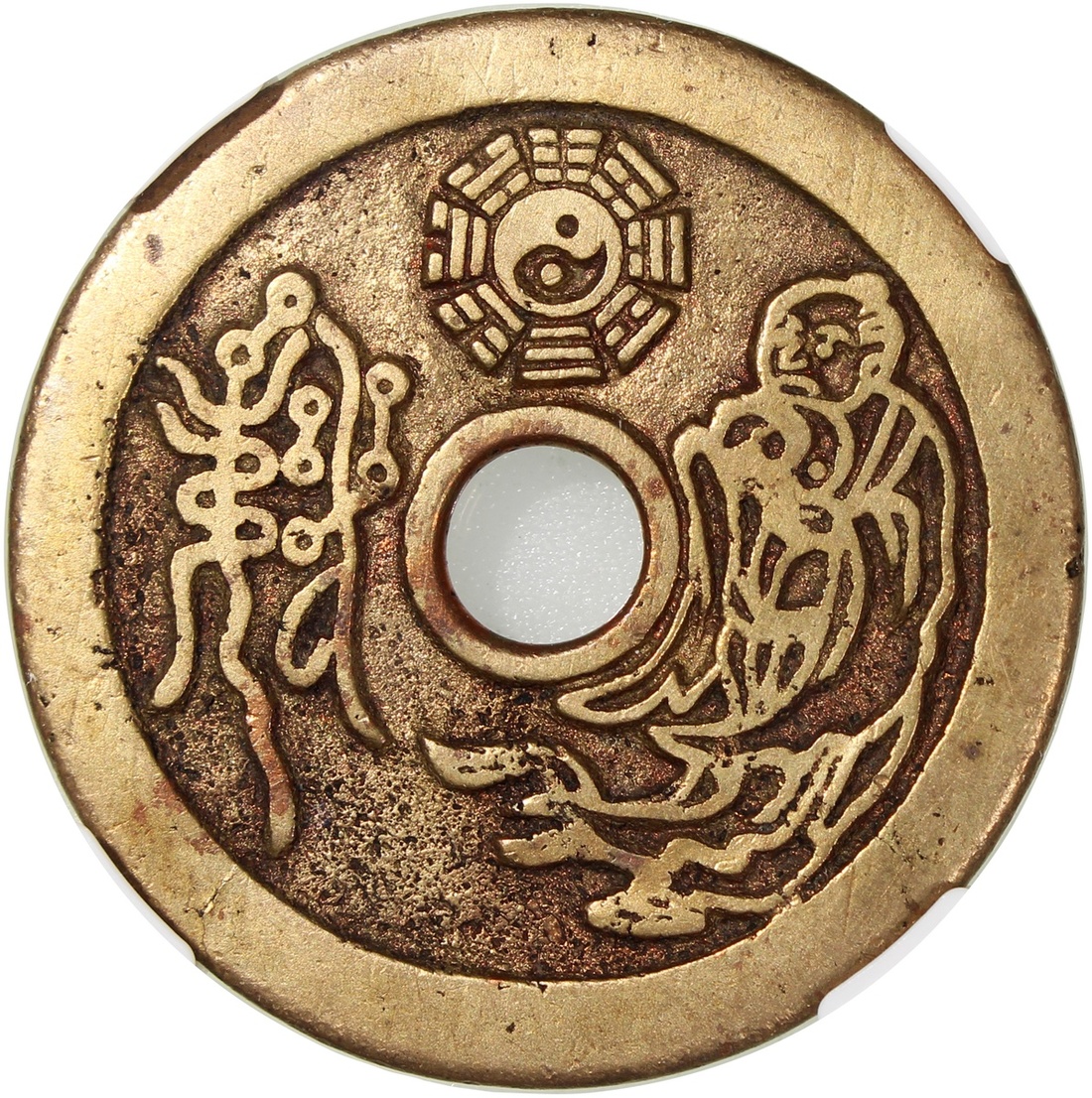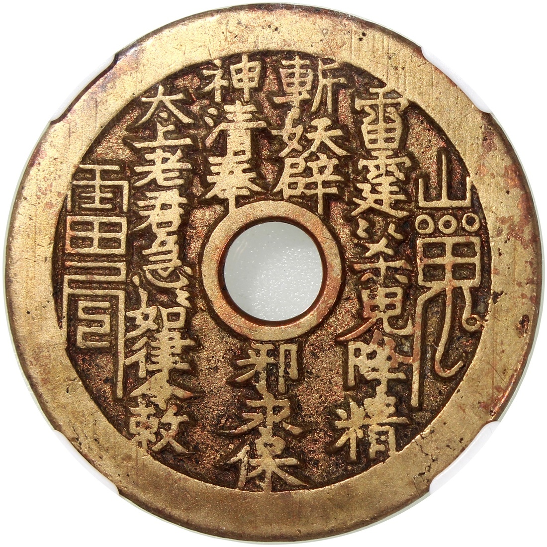 China: Qing Dynasty (1644-1911 CE), coin-shaped charm with round central hole, Jiangsu mint production, obverse inscribed 'Lei ting zhou', reverse inscribed Taoist spell script with human figure and Bagua, 45*2.0mm, 20.1g, Zhong Qian 82. Extremely fine.