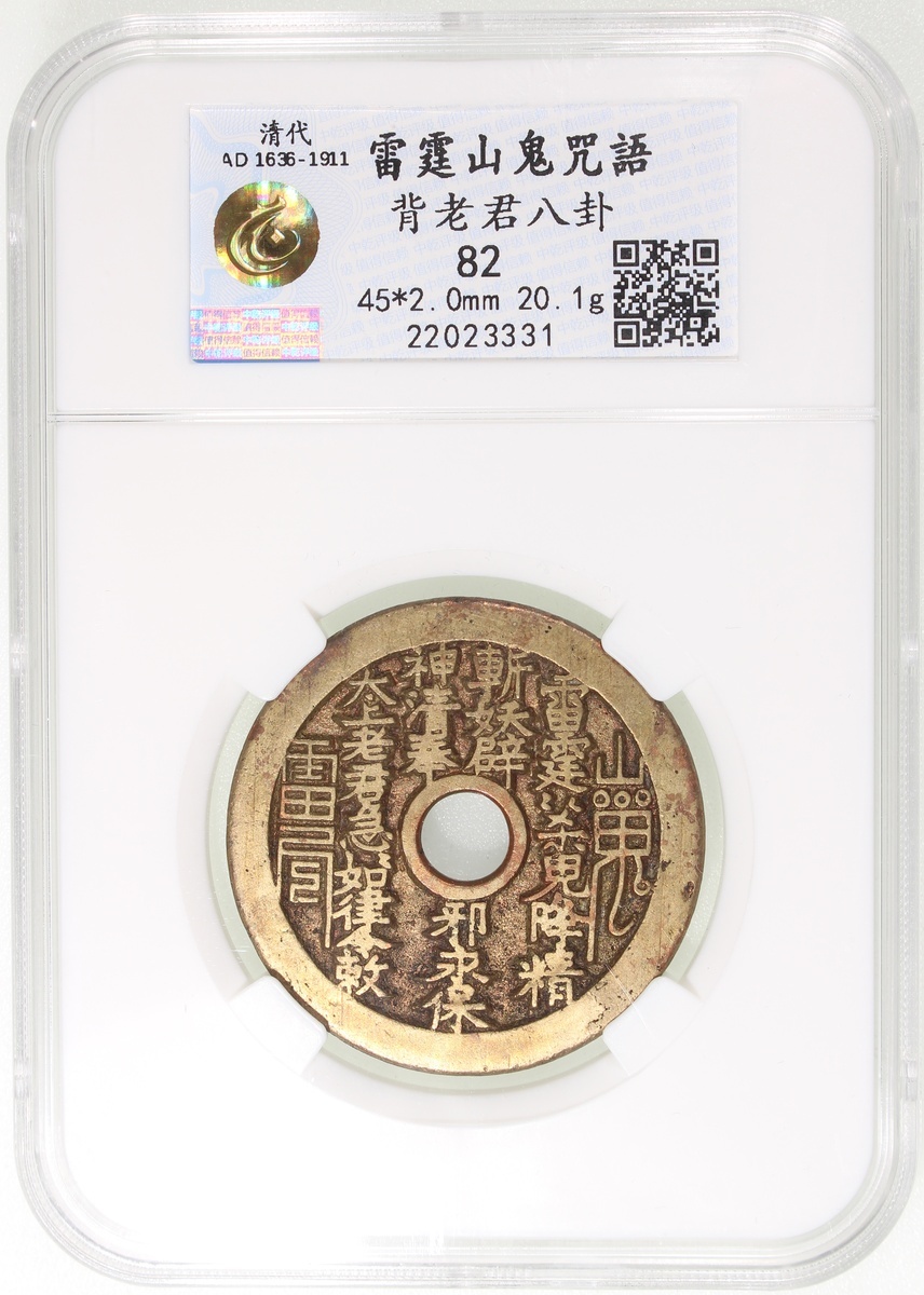 蘇爐山鬼雷霆咒圓穿花錢,背老君八卦,清朝(公元1644–1911),45*2.0mm,重20.1g,中乾82。品相極美。