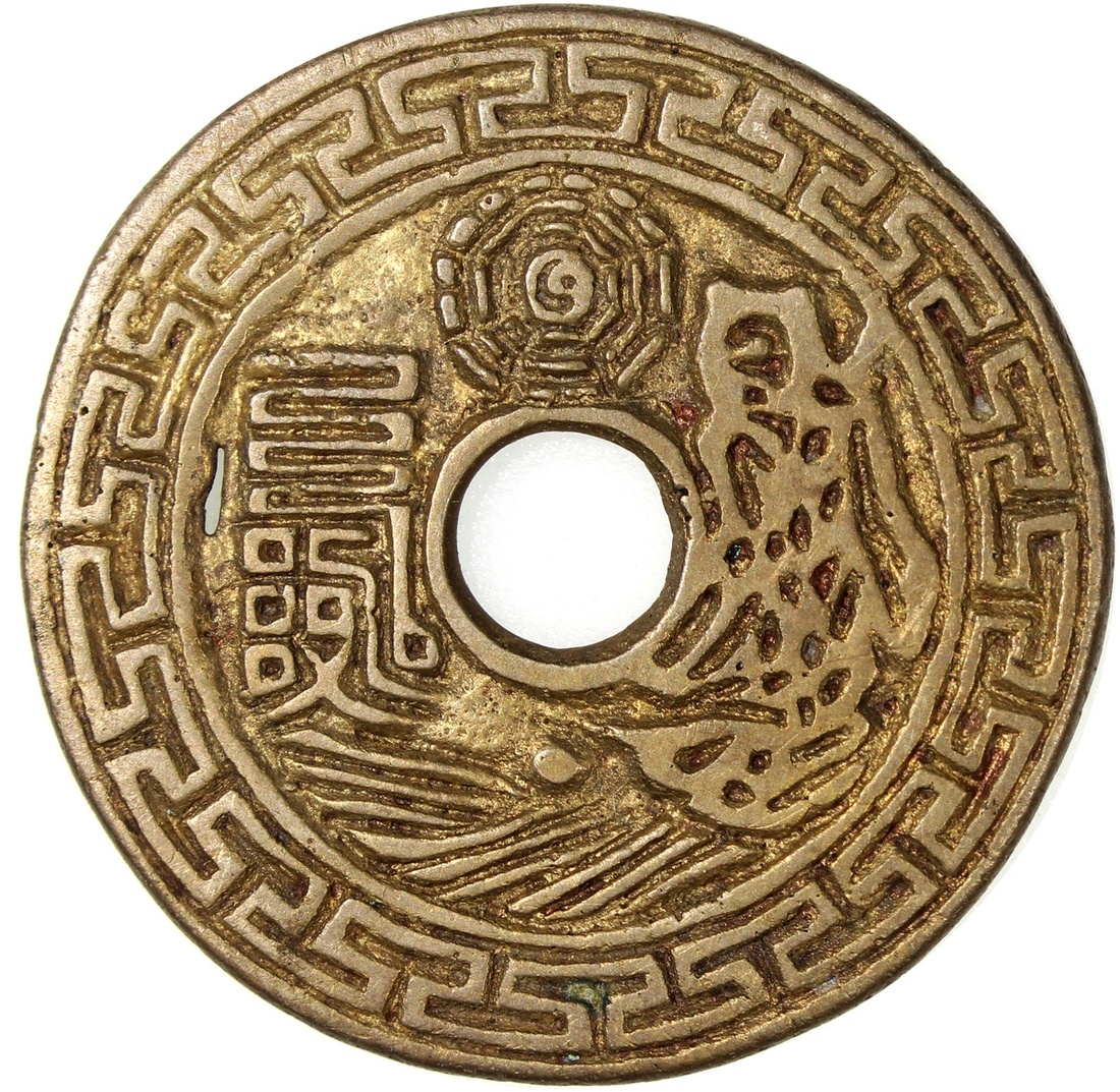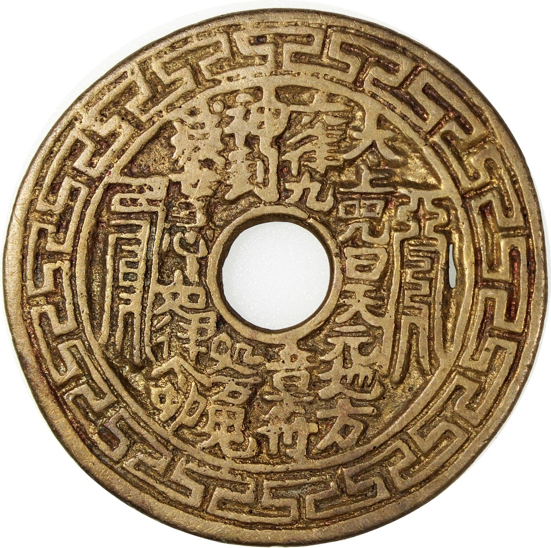 China: Qing Dynasty (1644-1911 CE), coin-shaped charm with round central hole, Yunnan mint production, obverse inscribed 'Tai shang zhou', reverse inscribed Taoist spell script with human figure and Bagua, 47.5*1.7mm, 22.9g. Extremely fine, nice broad rim. Outer rim decorated with patterns.