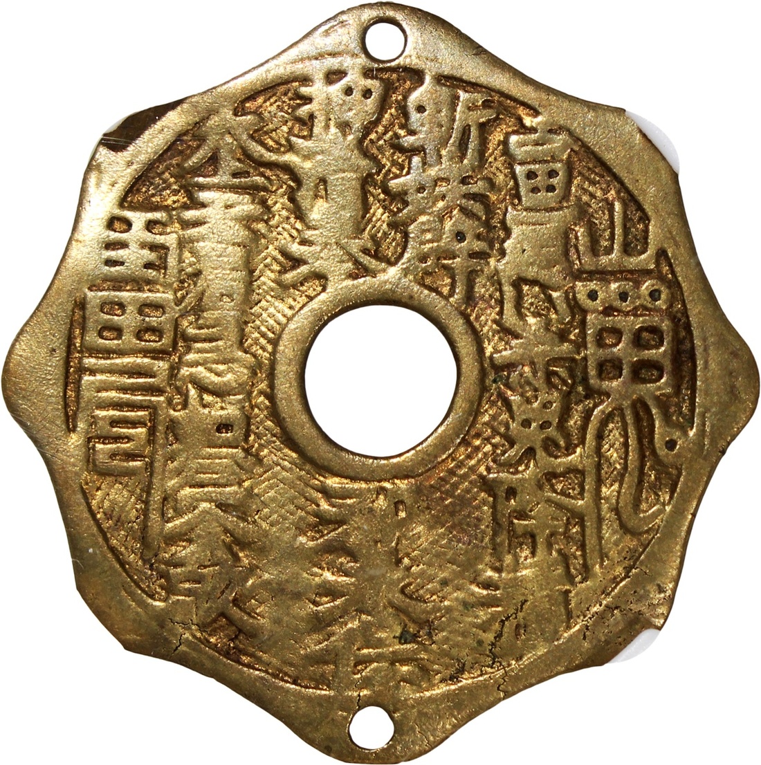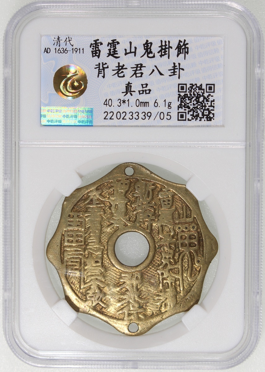 八邊形山鬼雷霆咒圓穿花錢,背老君八卦,清朝(公元1644–1911),40.3*1.0mm,重6.1g,中乾真品。