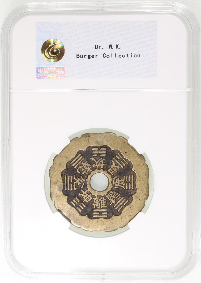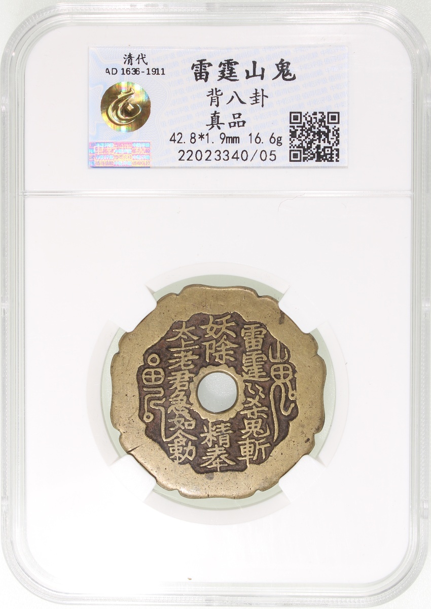 蘇爐八邊形山鬼雷霆咒圓穿花錢,背八卦,清朝(公元1644–1911),42.8*1.9mm,重16.6g,中乾真品。包漿熟潤,少見好品。
