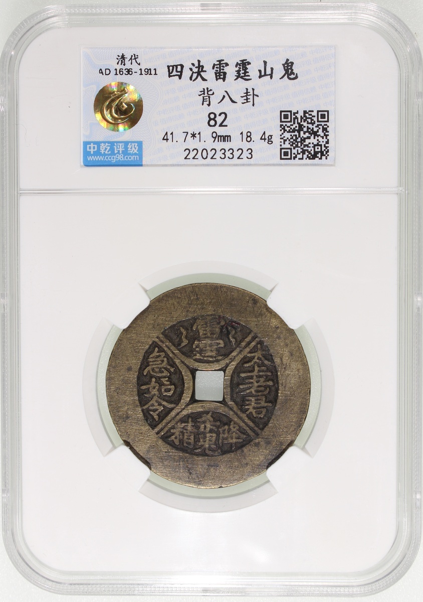 China: Qing Dynasty (1644-1911 CE), coin-shaped charm with square central hole, Jiangsu mint production, obverse inscribed 'Tai shang lao jun', reverse inscribed 'Chi ling' with Bagua, 41.7*1.9mm, 18.4g, Zhong Qian 82. Extremely fine, nice broad rim.