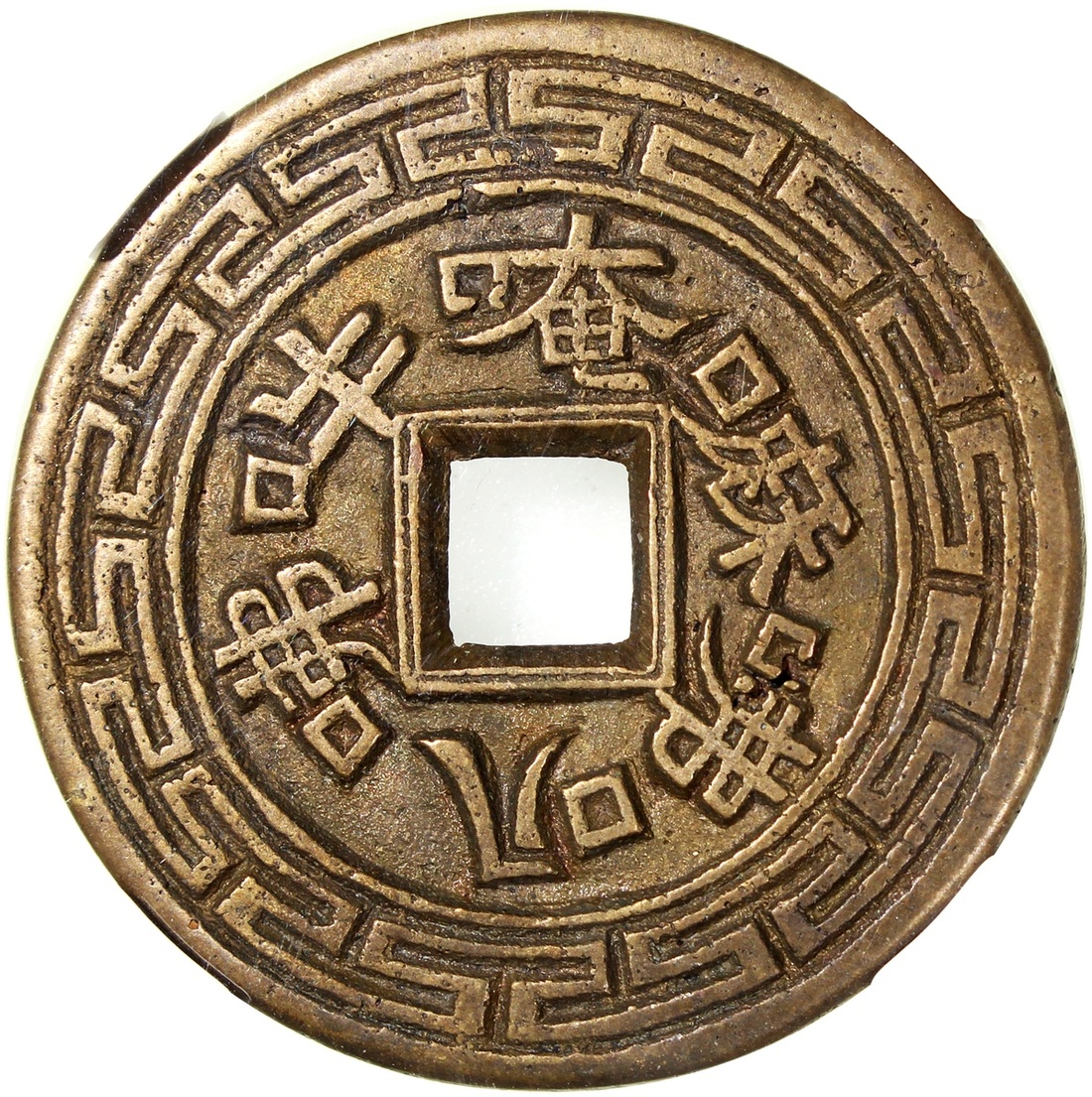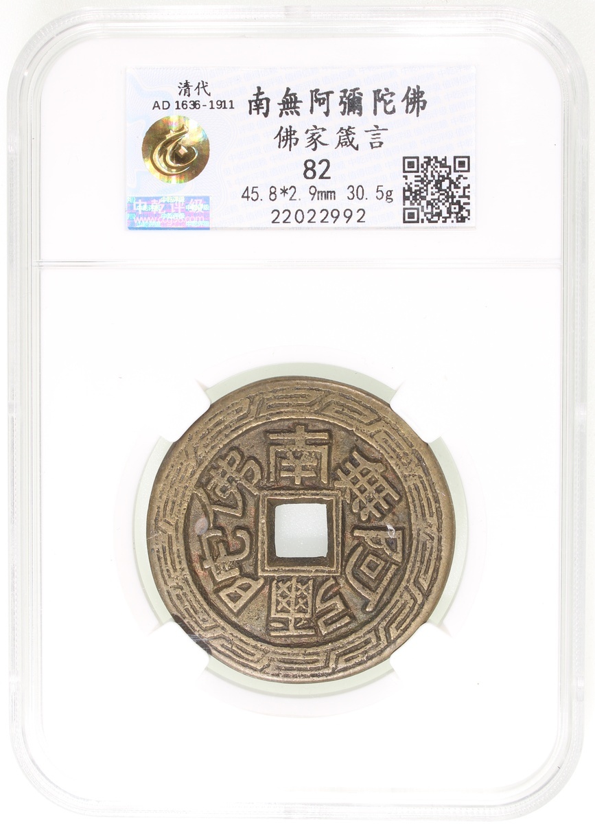 China: Qing Dynasty (1644-1911 CE), coin-shaped charm with square central hole, Sichuan mint production, obverse inscribed Chinese Buddhist mantra 'Namo amituofo', reverse inscribed Tibetan Buddhist incantation 'Om Mani Padme Hum', 45.8*2.9mm, 30.5g, Zhong Qian 82. Extremely fine.