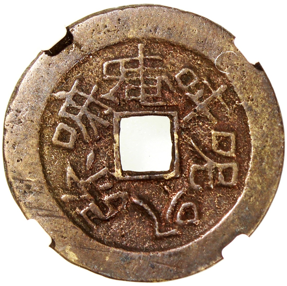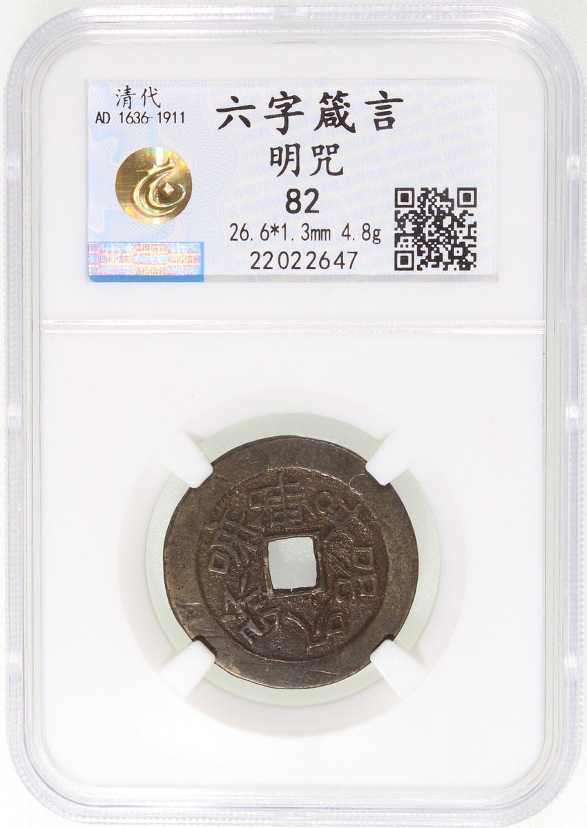 佛教六字箴言方穿花錢,背明咒,清朝(公元1644–1911),26.6*1.3mm,重4.8g,中乾82。少見。