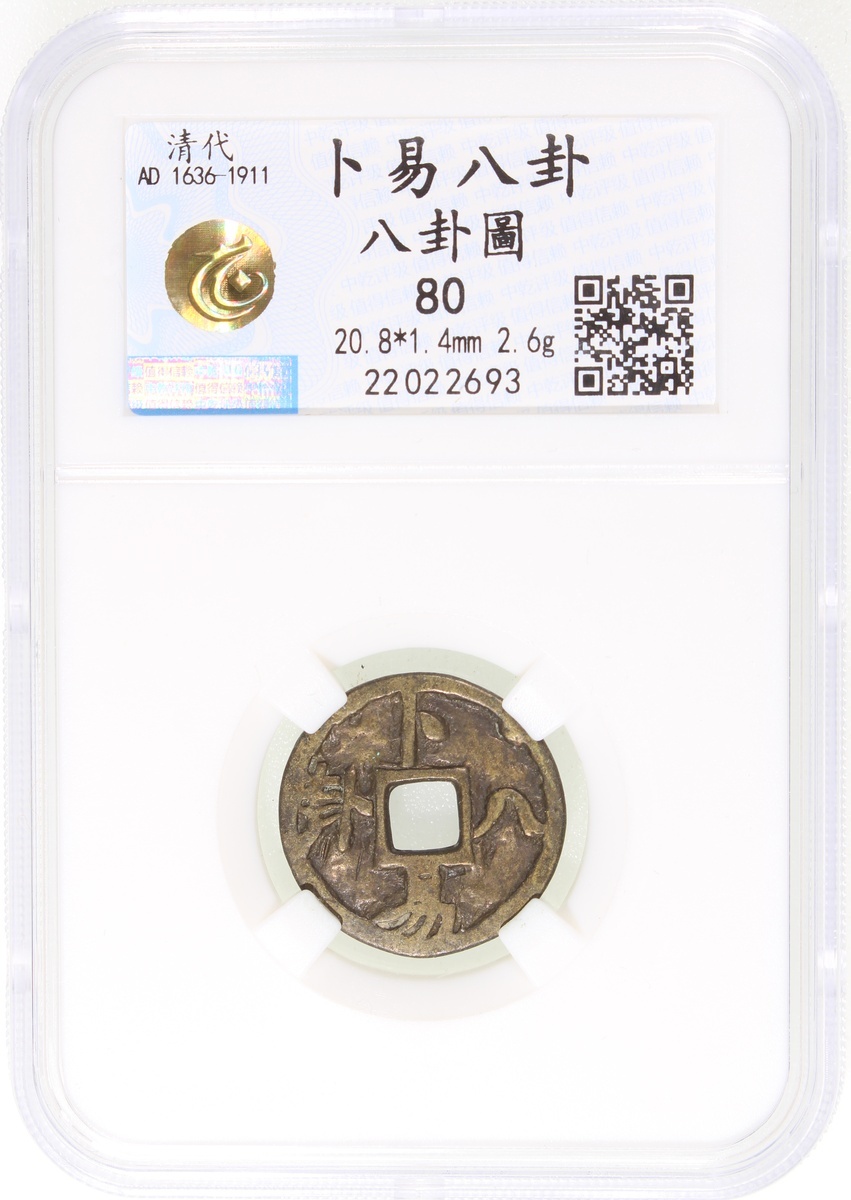 粵爐卜易八卦方穿花錢,背八卦圖,清朝(公元1644–1911),20.8*1.4mm,重2.6g,中乾80。品相極美。有硃砂痕跡,罕見。