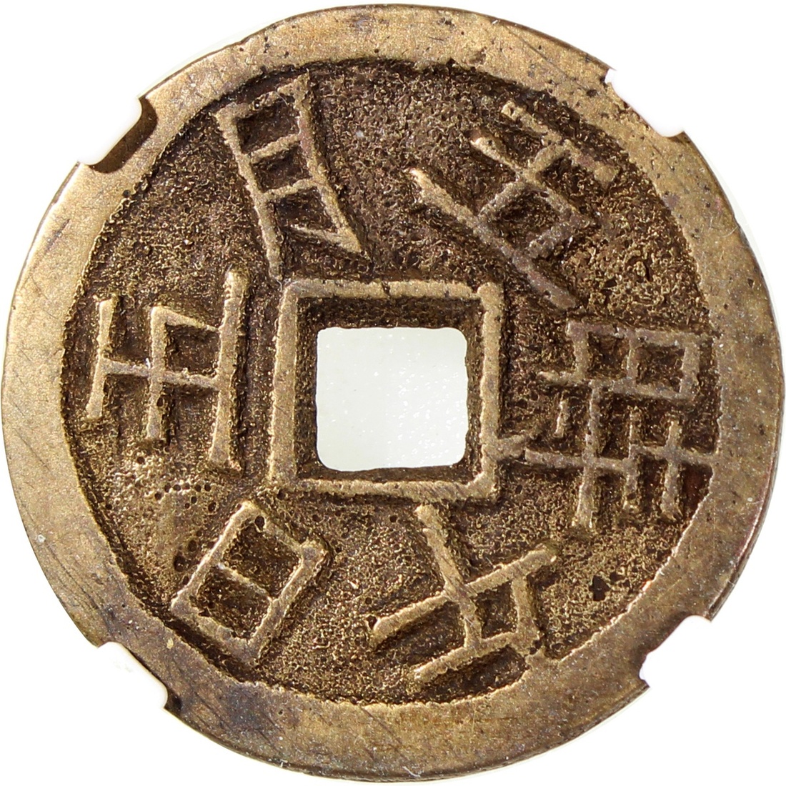 五月五日午時方孔花錢,背六字明咒,清朝(公元1644–1911),26.7*1.3mm,重4.6g,中乾82。品相極美,極少見。