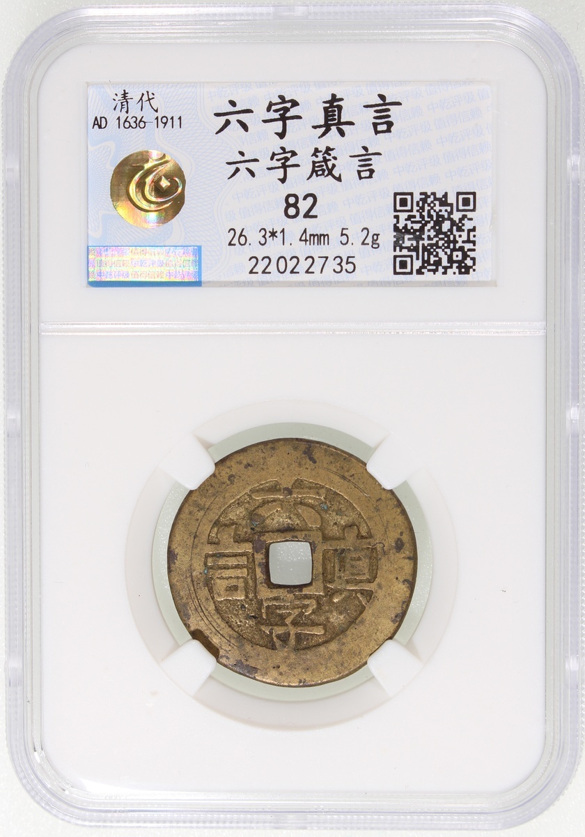 貴爐六字真言方孔花錢,背六字明咒,清朝(公元1644–1911),26.3*1.4mm,重5.2g,中乾82。此品鎏金,燦爛美觀,品相極美,極少見。