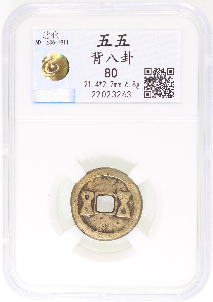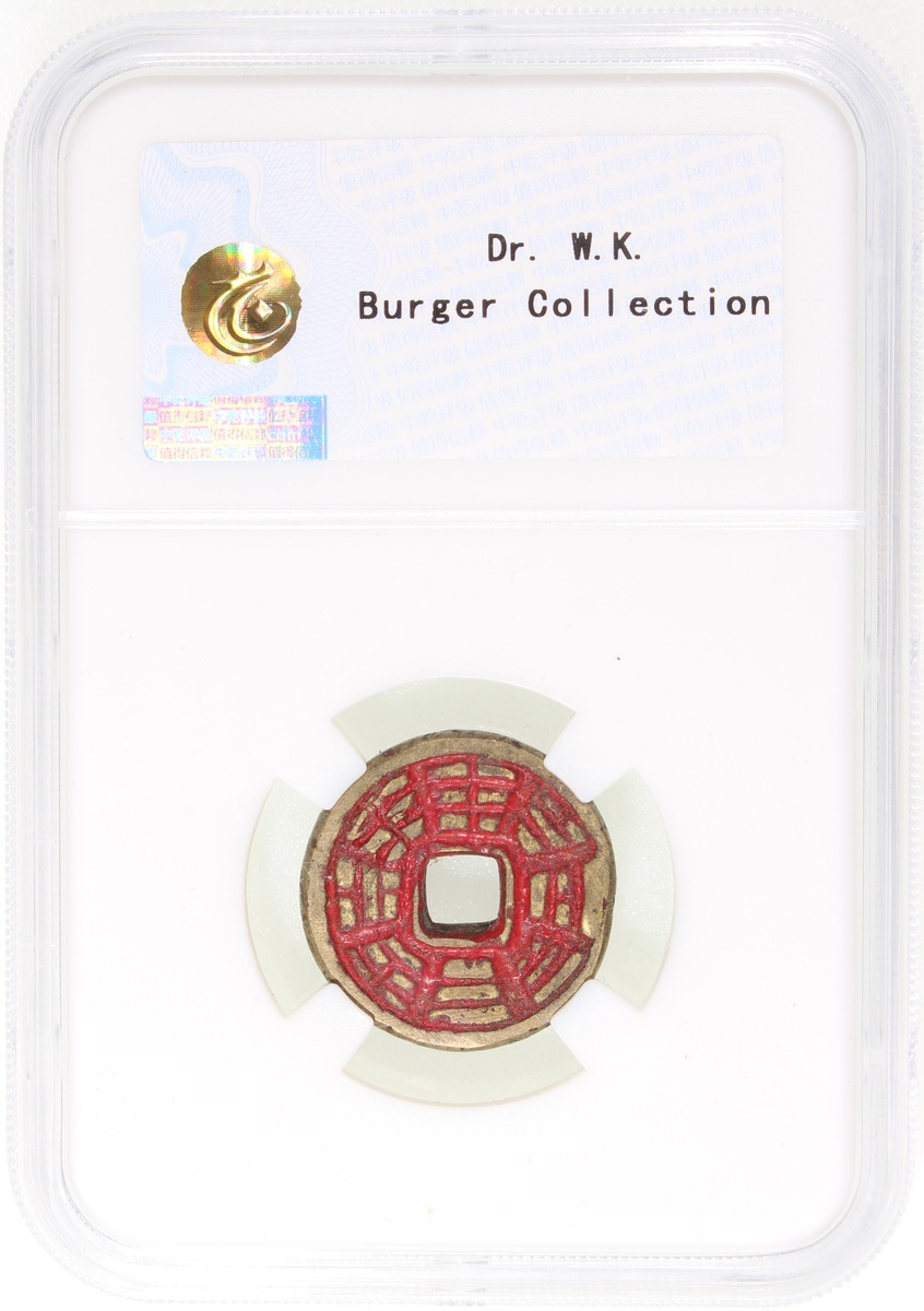 China: Qing Dynasty (1644-1911 CE), coin-shaped charm with square central hole, Guangdong mint production, obverse inscribed 'Wu wu' in seal script, reverse showing Bagua, 21.4*2.7mm, 6.8g, Zhong Qian 80. Extremely fine, reverse painted with cinnabar, extremely rare.