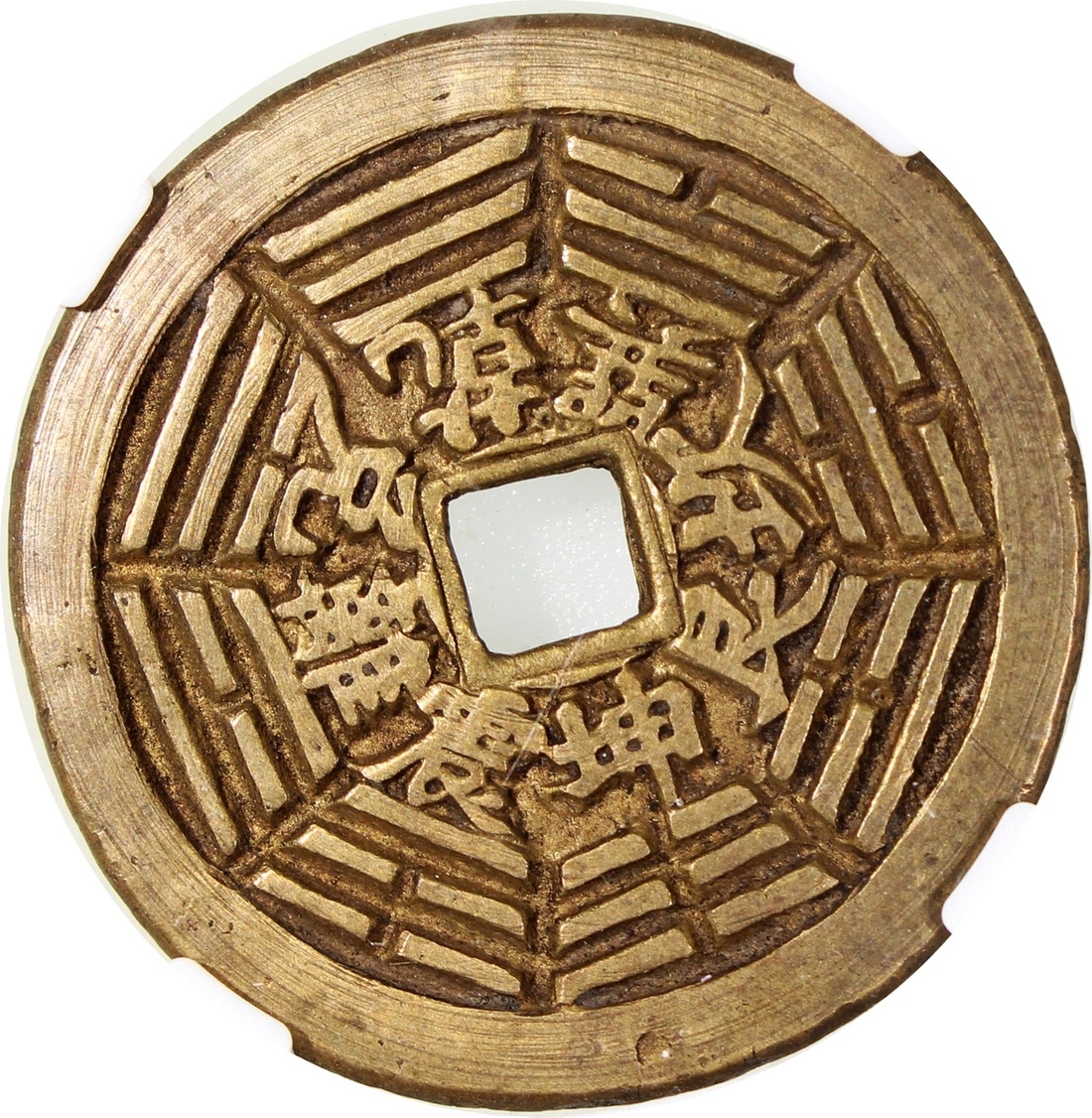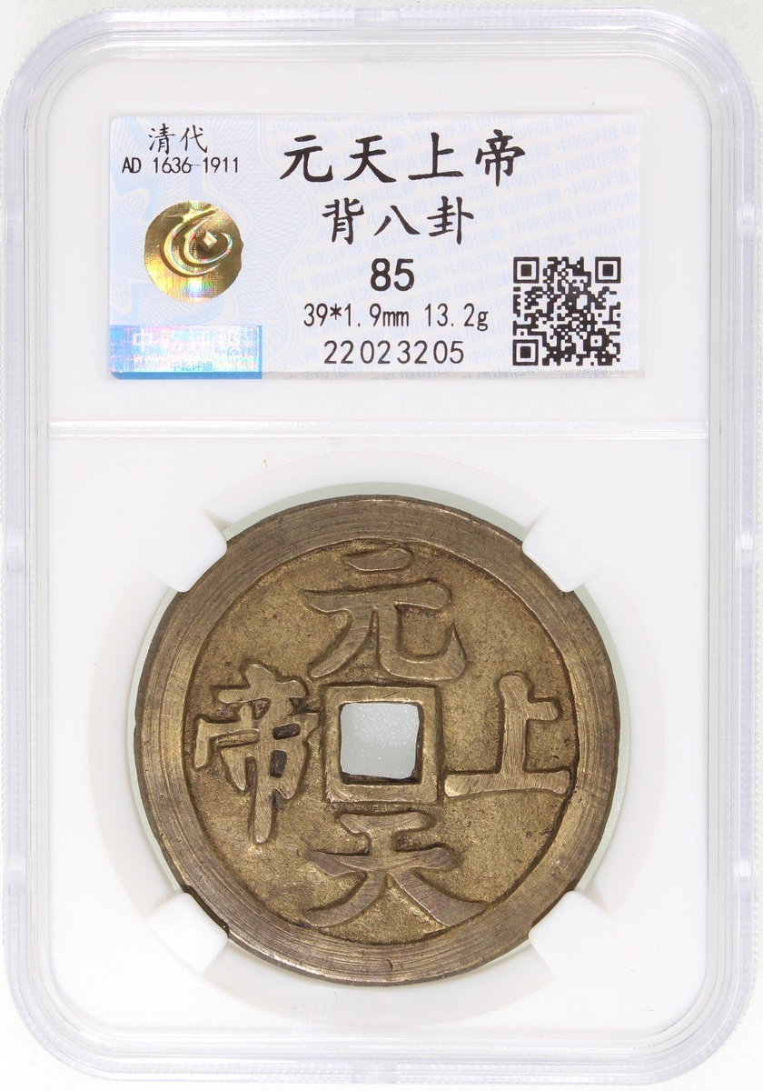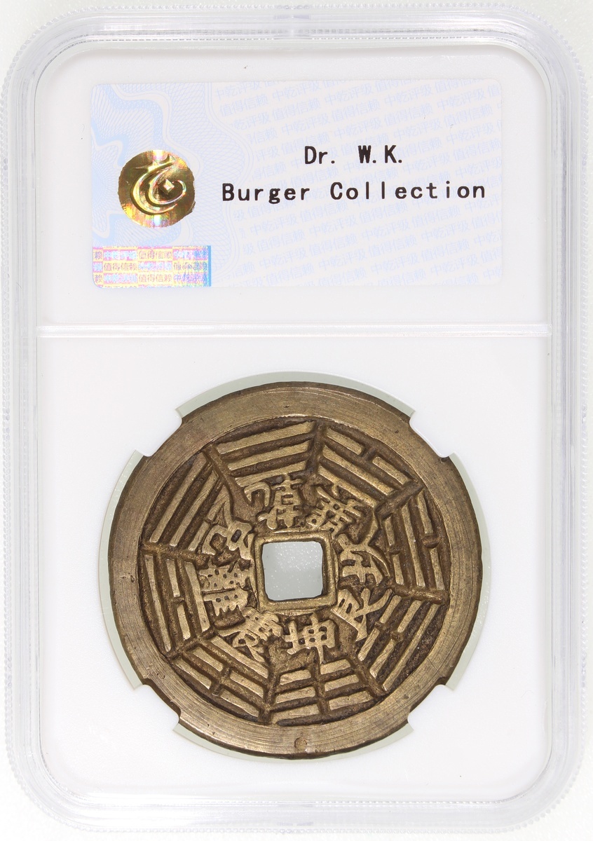 China: Qing Dynasty (1644-1911 CE), coin-shaped charm with square central hole, Guangdong mint production, obverse inscribed 'Yuan tian shang di', reverse showing Bagua with corresponding characters, 39*1.9mm, 13.2g, Zhong Qian 85. Extremely fine, very rare.