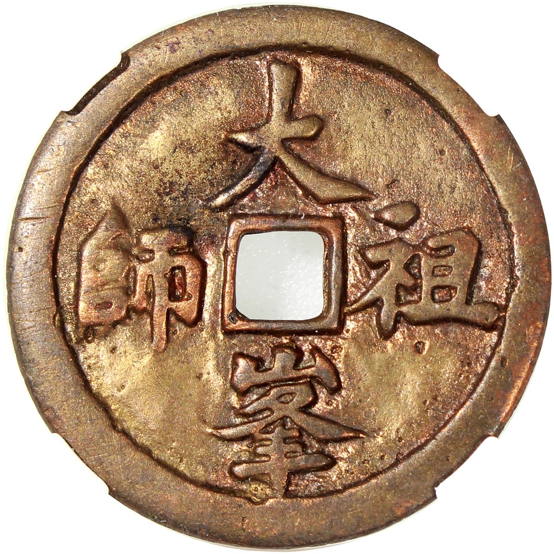 粵爐大峰祖師方孔花錢,背八卦,清朝(公元1644–1911),34.8*1.7mm,重9.4g,中乾80。極美。另:大峰祖師(1039-1127)俗姓林名靈噩,字通叟,法號大峰,祖籍浙江温州,北宋靖康之亂時入廣東潮陽,因其善德被尊為大峰祖師、祖師公,其廟位于廣東揭陽。