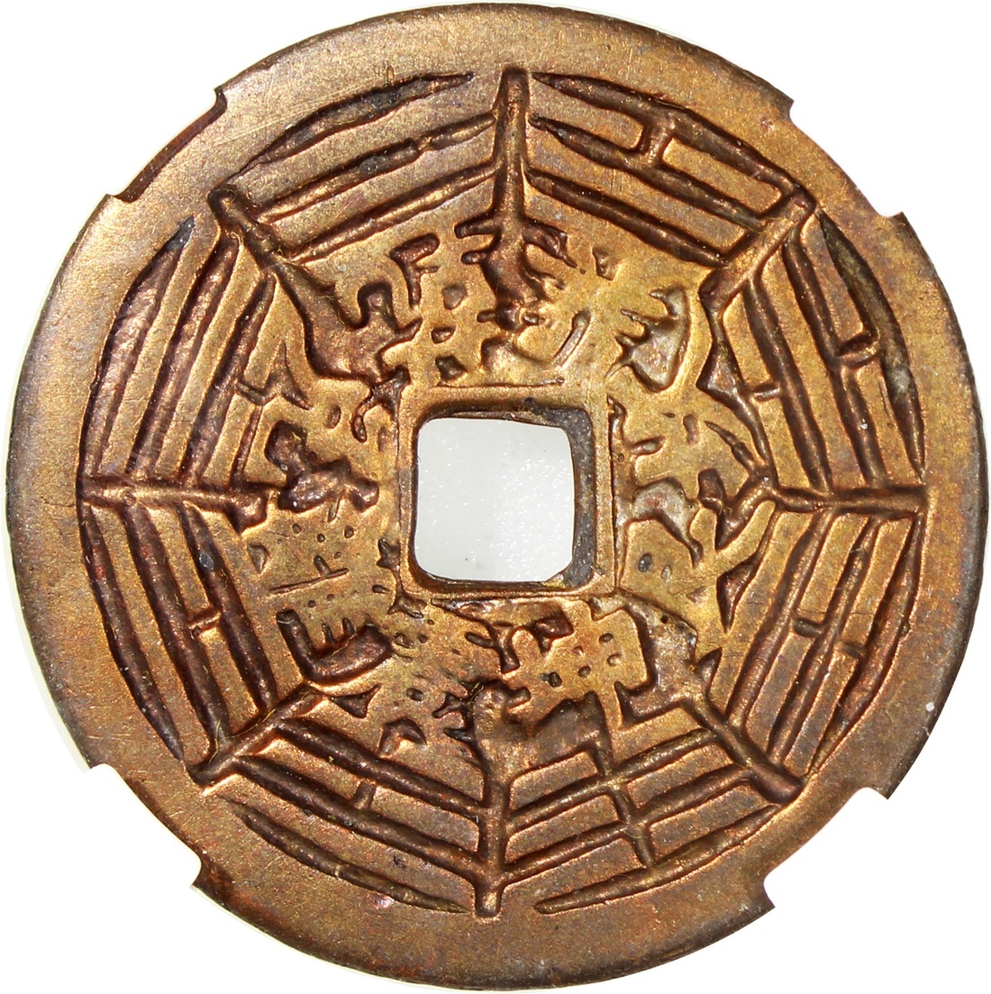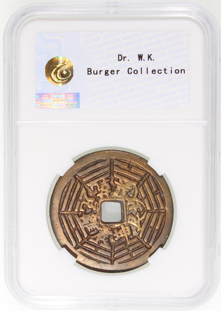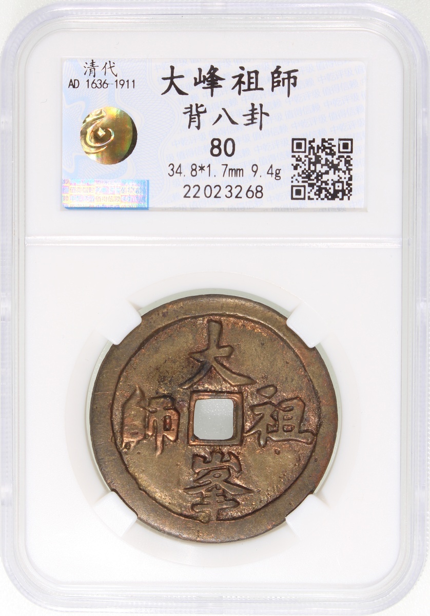 China: Qing Dynasty (1644-1911 CE), coin-shaped charm with square central hole, Guangdong mint production, obverse inscribed 'Da feng zu shi' in seal script, reverse showing Bagua, 34.8*1.7mm, 9.4g, Zhong Qian 80. Extremely fine, extremely rare. Note: Da Feng is the Buddhist title of Lin Ling-e (1039-1127), a native of Wenzhou in Zhejiang. He escaped to Swatow during the Jingkang Rebellion at the end of the Northern Song. He became a well-known and respected Buddhist monk there for his charitable deeds and is widely known as Zu shi, the Patriarch. A temple dedicated to him can still be found to this day in Jieyang, Guangdong Province.