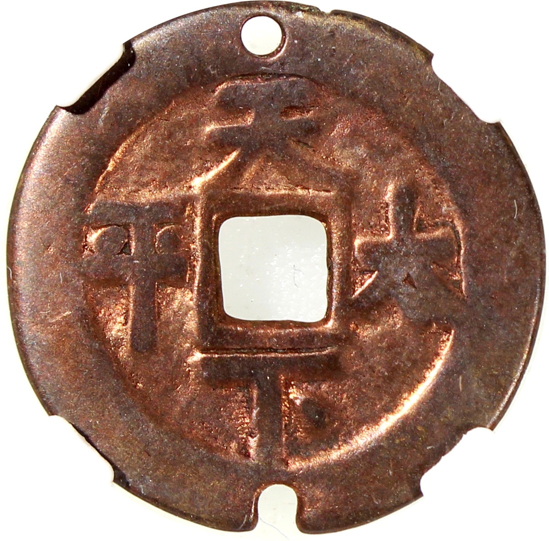 China: Qing Dynasty (1644-1911 CE), coin-shaped charm with square central hole, obverse inscribed 'Tian xia tai ping', reverse showing Bagua, 22.7*0.9mm, 2.4g, Zhong Qian Genuine. Very rare.