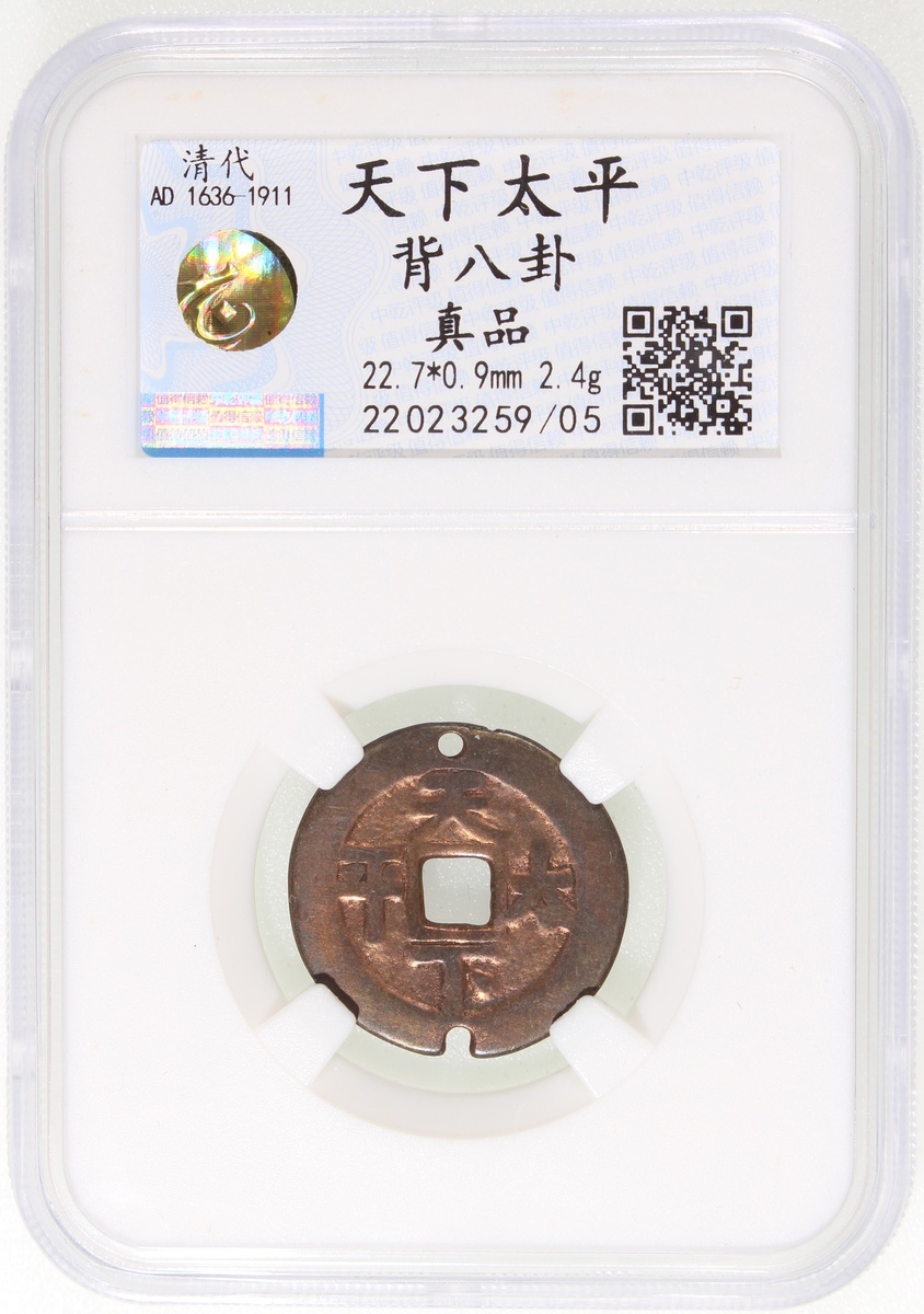天下太平方孔花錢,背八卦,清朝(公元1644–1911),22.7*0.9mm,重2.4g,中乾真品。少見。