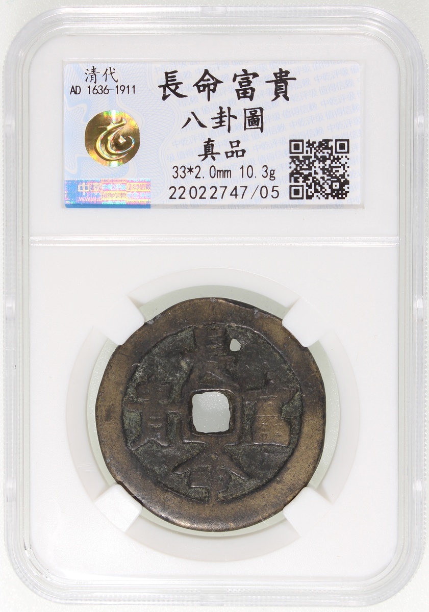 長命富貴方孔花錢,背八卦,清代,(公元1644–1911),33*2.0mm,重10.3g,中乾真品。品相極美,極少見。