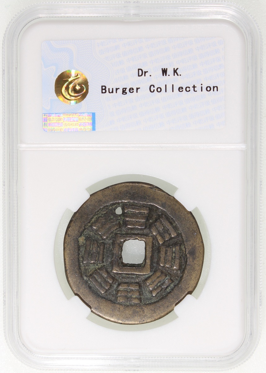China: Qing Dynasty (1644-1911 CE), coin-like charm with square central hole, obverse inscribed 'Chang ming fu gui', reverse showing Bagua, 33*2.0mm, 10.3g, Zhong Qian Genuine. Extremely fine, extremely rare.