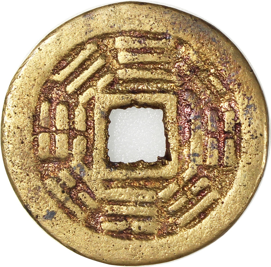 China: Qing Dynasty (1644-1911 CE), coin-shaped charm with square central hole, obverse inscribed 'Chang ming fu gui', reverse showing Bagua, 30.2*1.6mm, 7.4g.