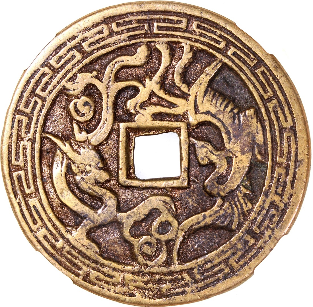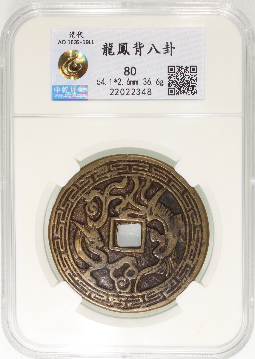 China: Qing Dynasty (1644-1911 CE), coin-like charm with square hole, Yunnan mint production, obverse showing dragon and phoenix, reverse inscribed Bagua signs and their corresponding characters, 54.1*2.6mm, 36.6g, Zhong Qian 80.