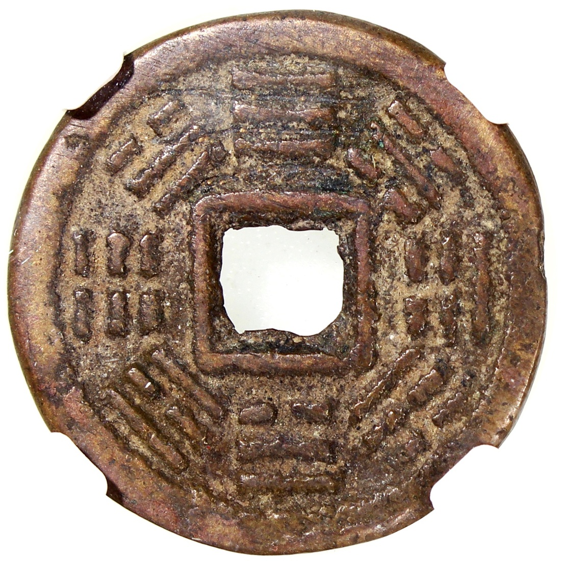 China: Qing Dynasty (1644-1911 CE), coin-shaped charm with square central hole, obverse showing dragon and phoenix, reverse showing Bagua, 27.3*1.9mm, 7.0g. Zhong Qian 78. Very fine, rare.