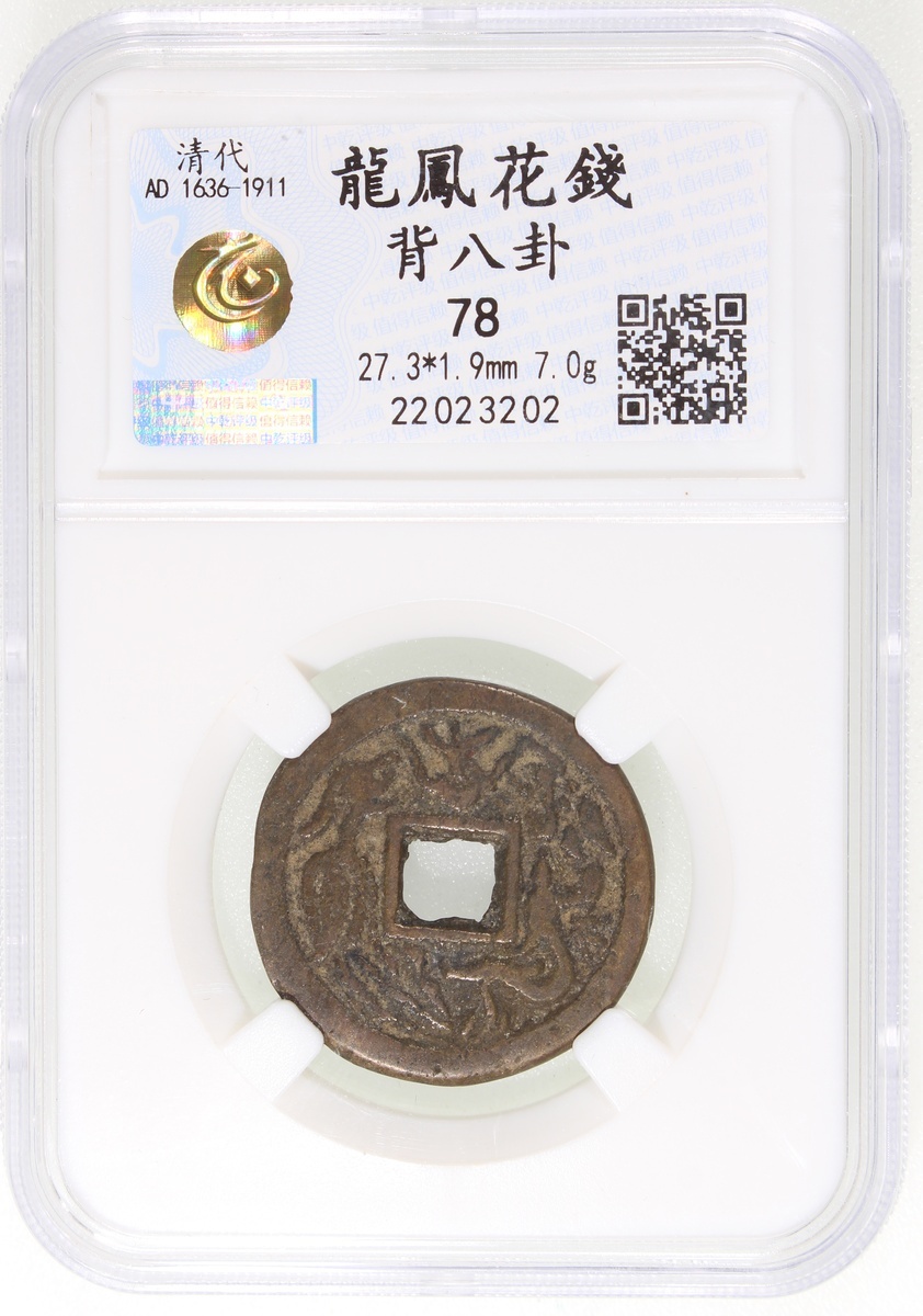 龍鳳方穿花錢,背八卦,清朝(公元1644–1911),27.3*1.9mm,重7.0g,中乾78。上美,少見。