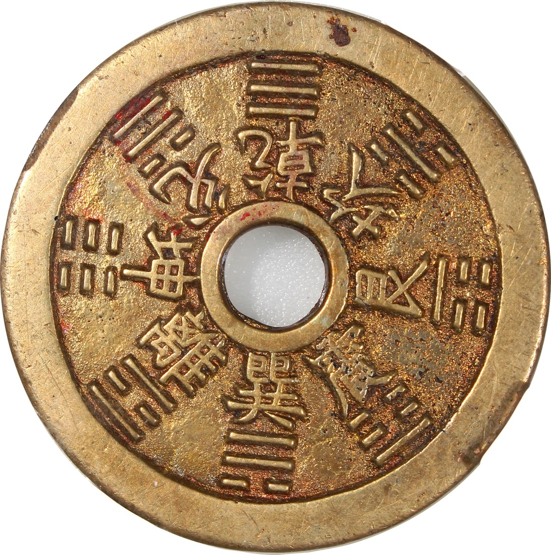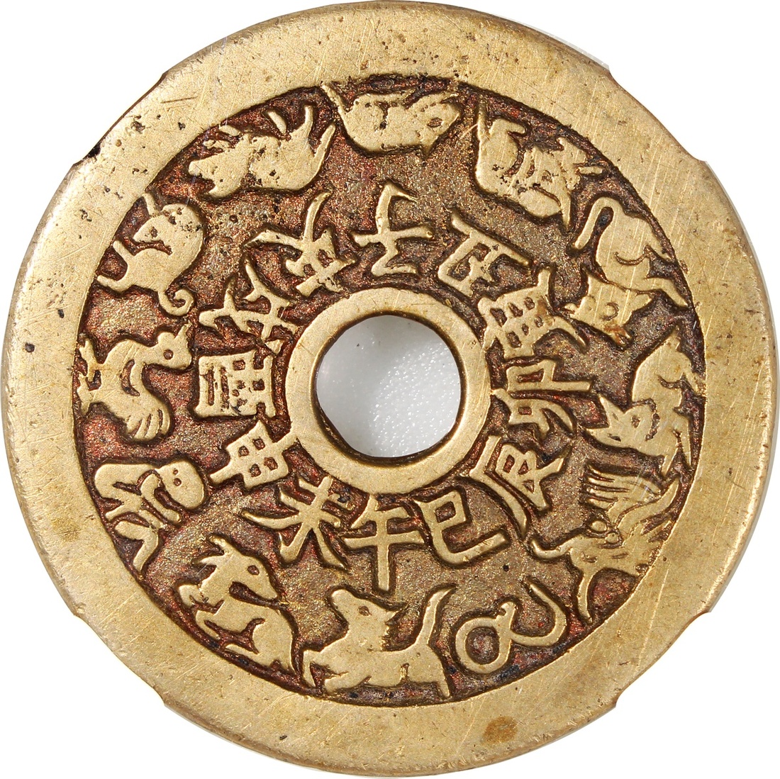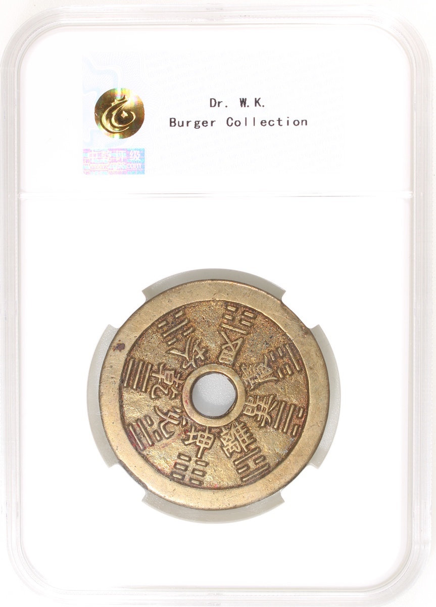 China: Qing Dynasty (1644-1911 CE), coin-like charm with round central hole, obverse decorated with 12 zodiacal signs, reverse with Bagua signs, 46*2.2mm, 24.6g, Zhong Qian 85. A very pleasing variation of this type, beautiful example, very rare.