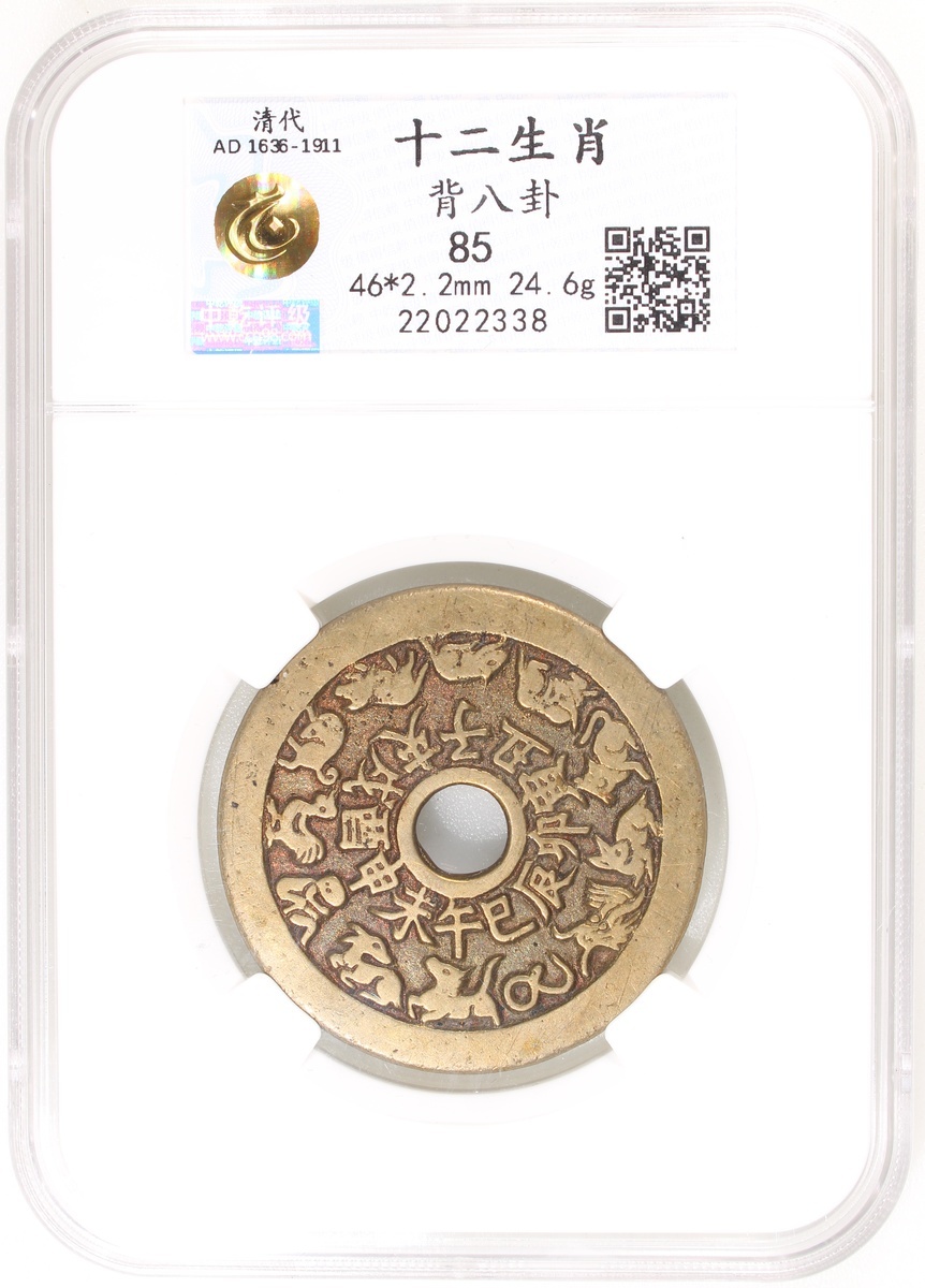 十二生肖圓穿花錢,背八卦,清朝(公元1644–1911),46.0*2.2mm,重24.6g,中乾85。此版肖形、文字均工整,品相華麗,極美版,極難得。