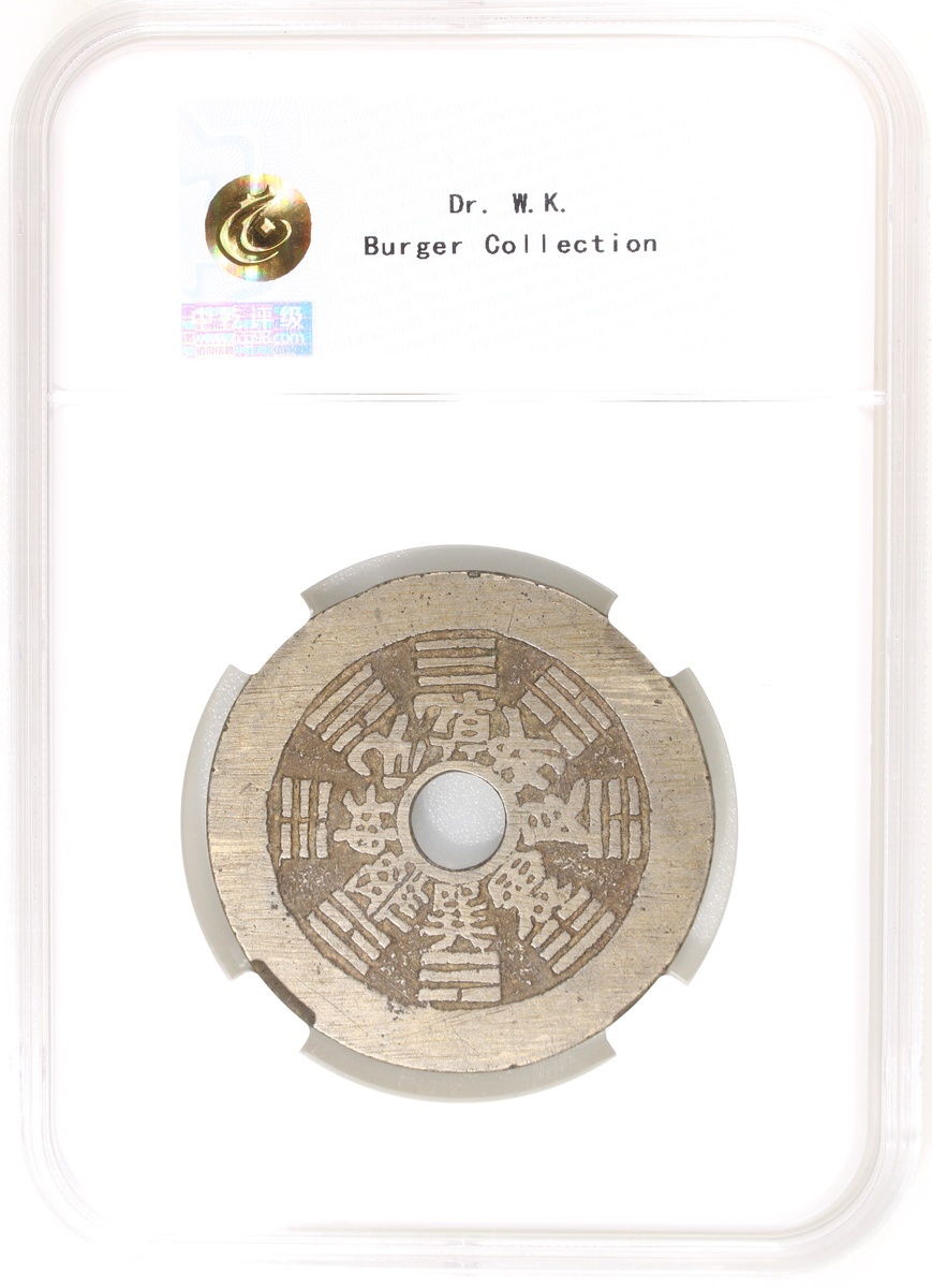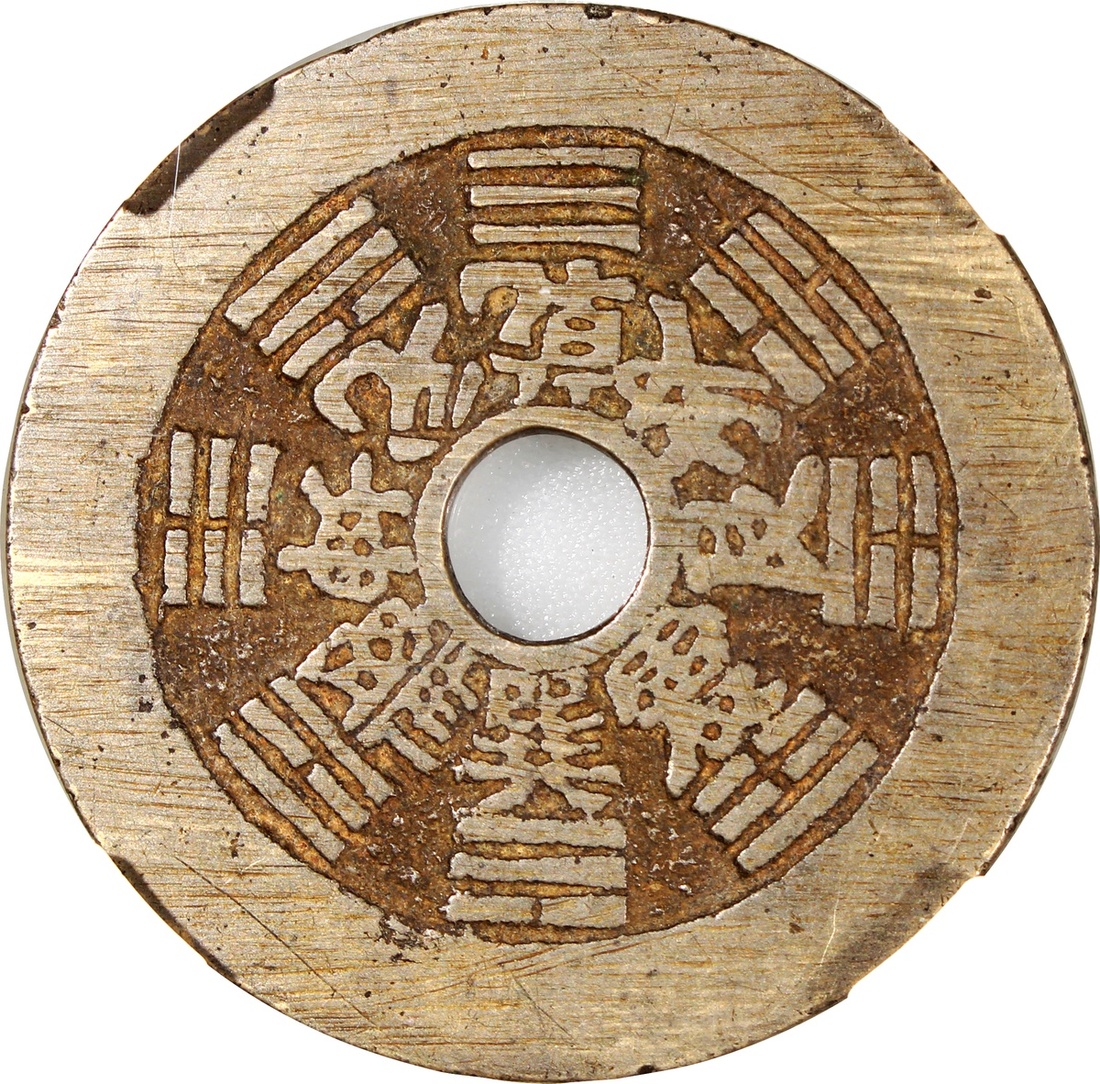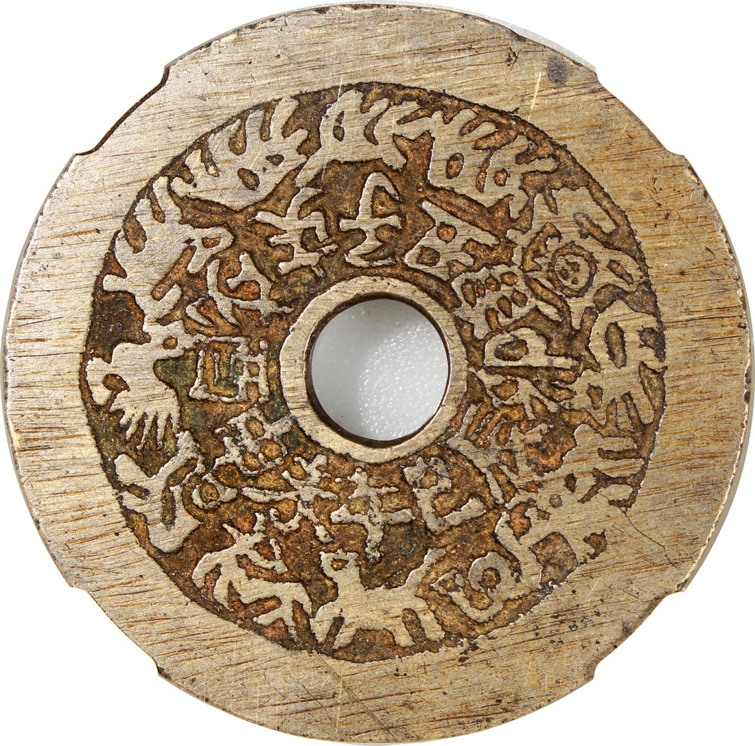 China: Qing Dynasty (1644-1911 CE), coin-like charm with round central hole, obverse decorated with 12 zodiacal signs, reverse with Bagua signs, 48*1.7mm, 23.4g, Zhong Qian 82. A highly uncommon edition of this type, extremely fine, very rare.