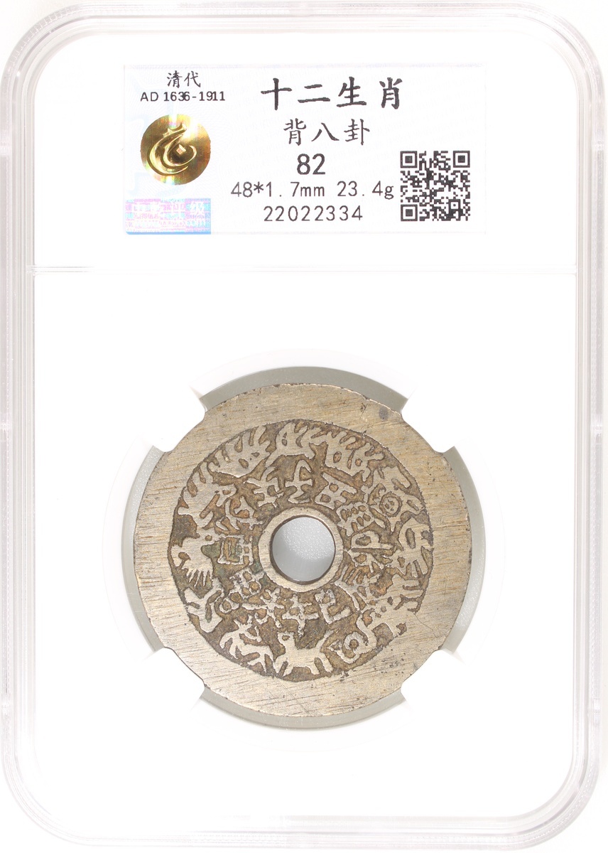 十二生肖圓穿花錢,背八卦,清朝(公元1644–1911),48*1.7mm,重23.4g,中乾82。稀見版,品相極美,少見。