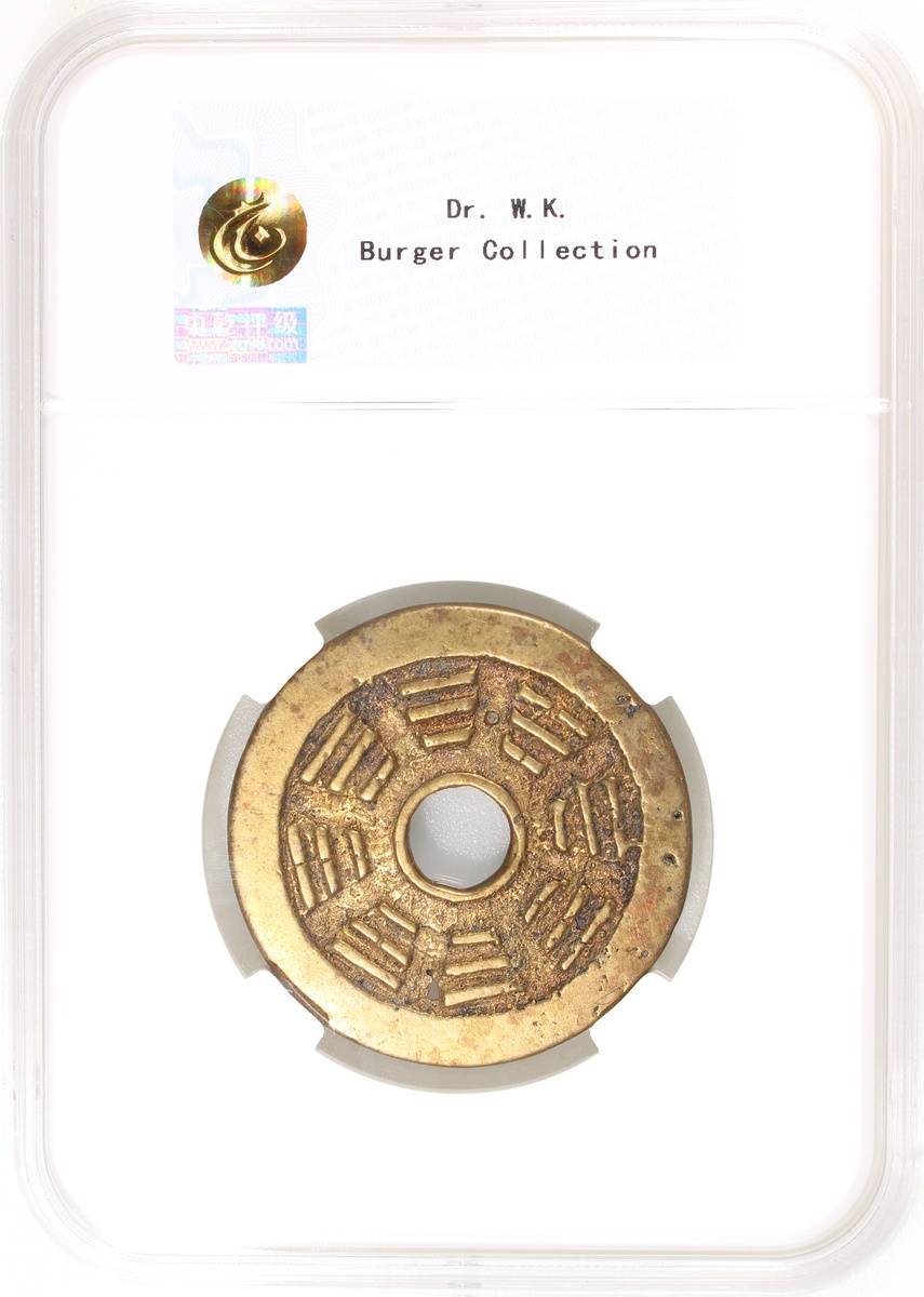 China: Qing Dynasty (1644-1911 CE), coin-like charm with round central hole, obverse decorated with 12 zodiacal signs, reverse decorated with Bagua signs, 43*2.1mm, 19.5g, Zhong Qian Genuine.