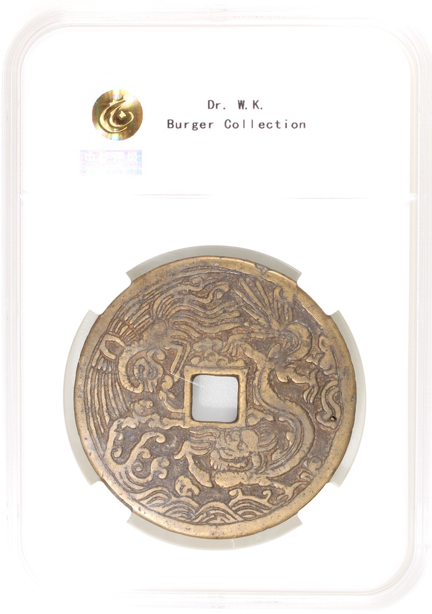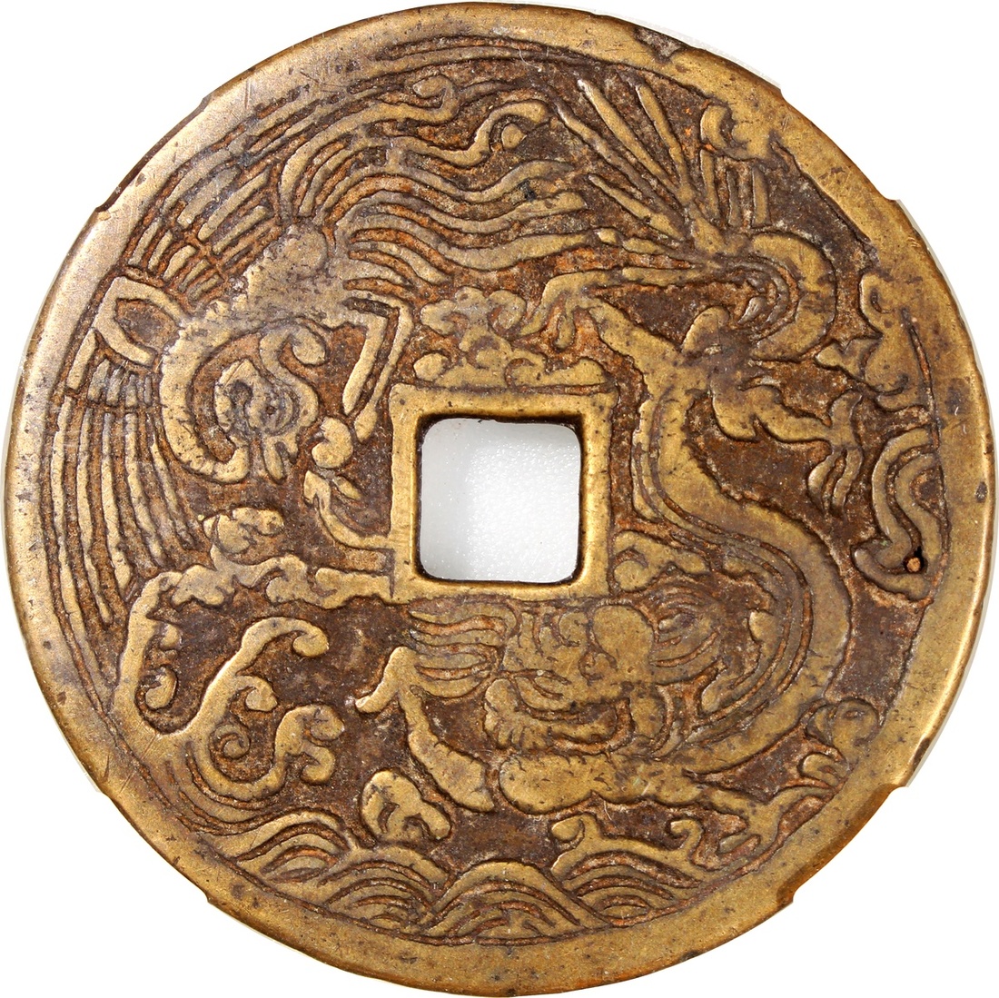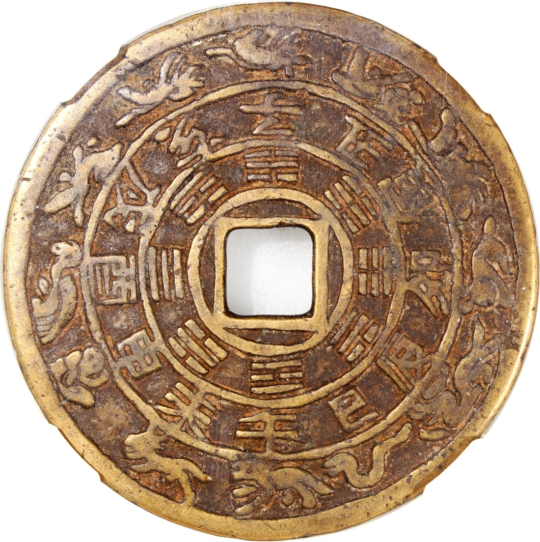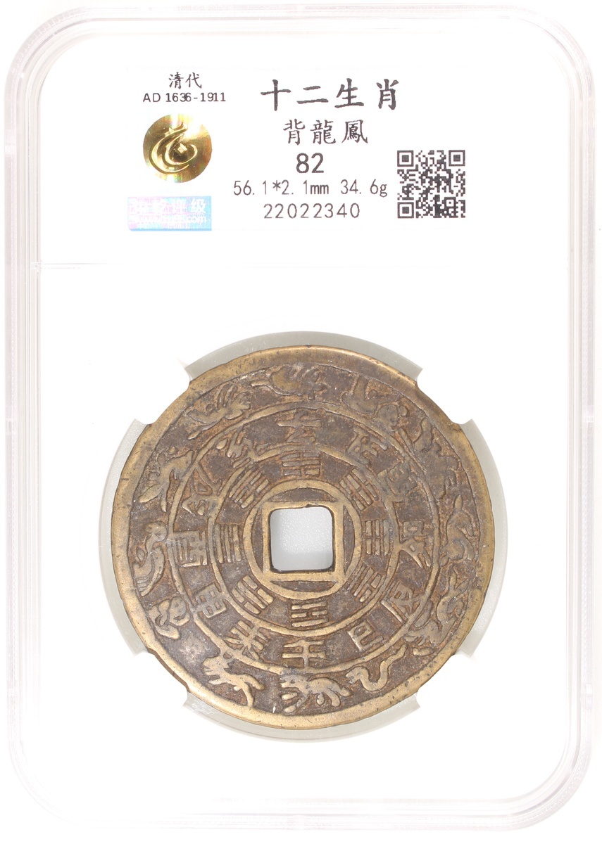 China: Qing Dynasty (1644-1911 CE), coin-like charm with square central hole, Guizhou mint production, obverse decorated with 12 zodiacal signs and Bagua signs, reverse showing dragon and phoenix over sea waves, 56.1*2.1mm, 34.6g, Zhong Qian 82. A beautiful exemplar example from the Guizhou mint, very rare.