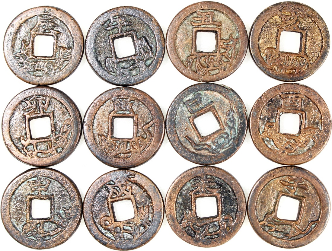 單肖背符篆方穿花錢一套十二枚,金元(公元1115–1368)時期,約15.9*1.9mm,重2.4g。品相極美,全套少見。