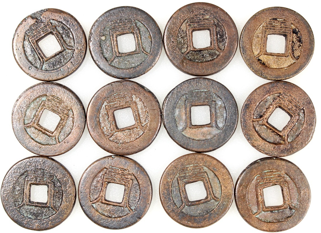 China: Jin-Yuan Dynasty (1115-1368 CE), a complete set of 12 coin-shaped charms with square central hole, obverse showing zodiacal sign with corresponding character, reverse showing Taoist spell character, c. 15.9*1.9mm, 2.4g. Extremely fine, rare as a full set.