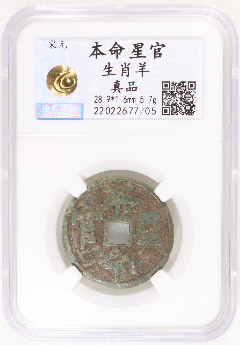 China: Song-Yuan Dynasty (960-1368 CE), coin-shaped charm with square central hole, obverse inscribed with 'Ben ming xing guan', reverse showing celestial guardian god with goat, 28.9*1.6mm, 5.7g, Zhong Qian Genuine. Rare.
