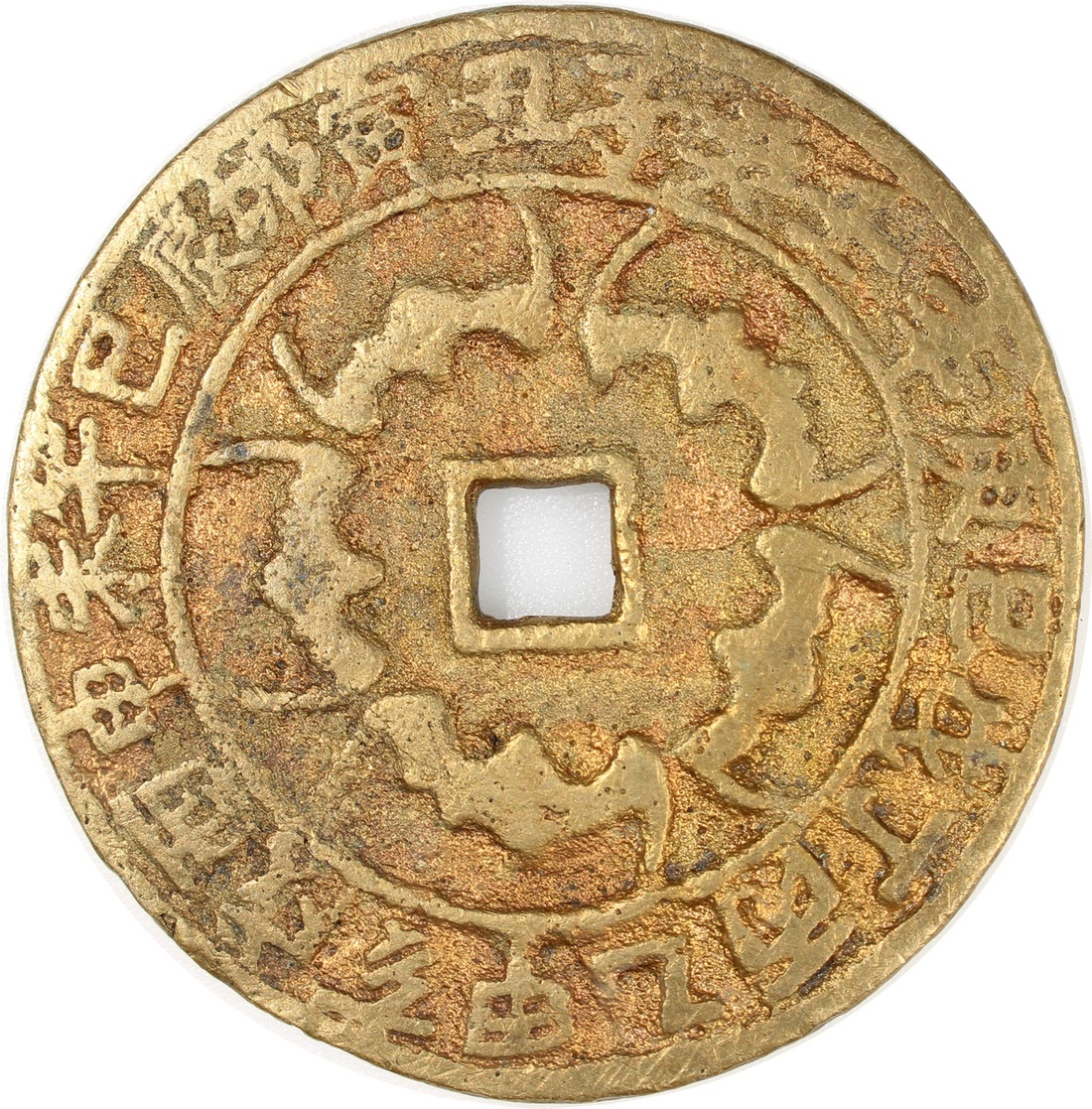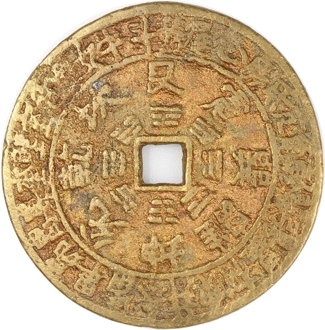 China: Qing Dynasty (1644-1911 CE), coin-like charm with square hole, Guizhou mint production, obverse inscribed 10 heavenly stems, 12 earthly branches, and 5 bats, reverse inscribed Bagua and constellations, 66.0*3.9mm, 83.3g.