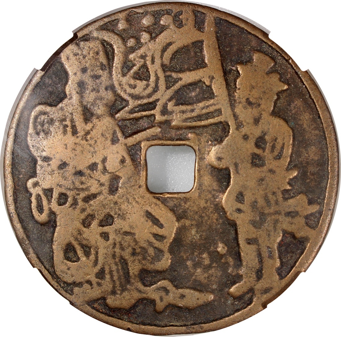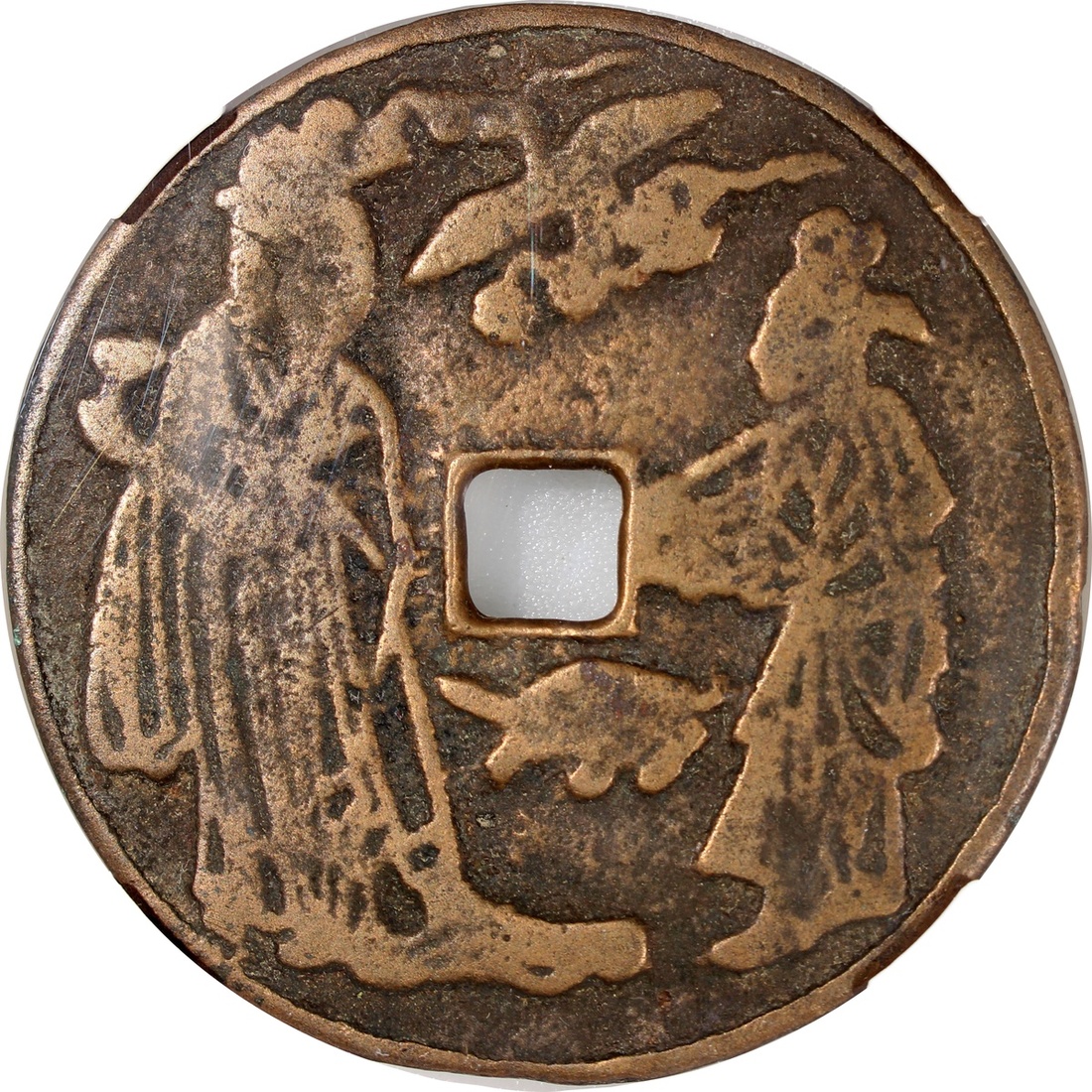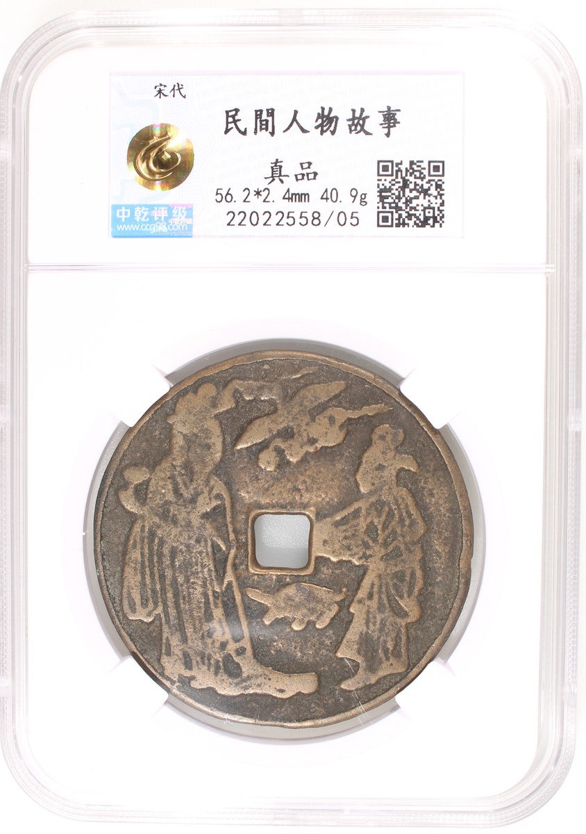 China: Song-Yuan Dynasty (960-1368 CE), coin-shaped charm with square central hole, obverse showing celestial guardian god with attendant, reverse showing the Black Warrior with attendant, 56.2*2.4mm, 40.9g, Zhong Qian Genuine, labelled as Song Dynasty.