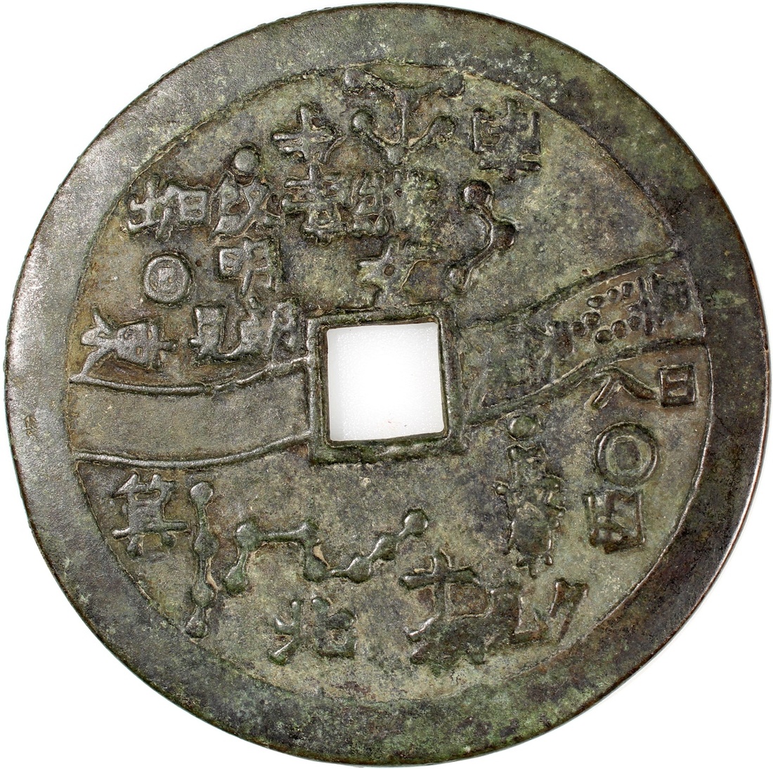 China: Ming Dynasty (1368-1644 CE), coin-like charm with square central hole, obverse showing constellations and the galaxy, plane reverse, 79.1*3.7mm, 99.4g. Thick and heavy, very rare. Note: It is not common to see charms with a plain reverse. Those with a plain reverse tend to be of exceptional quality.