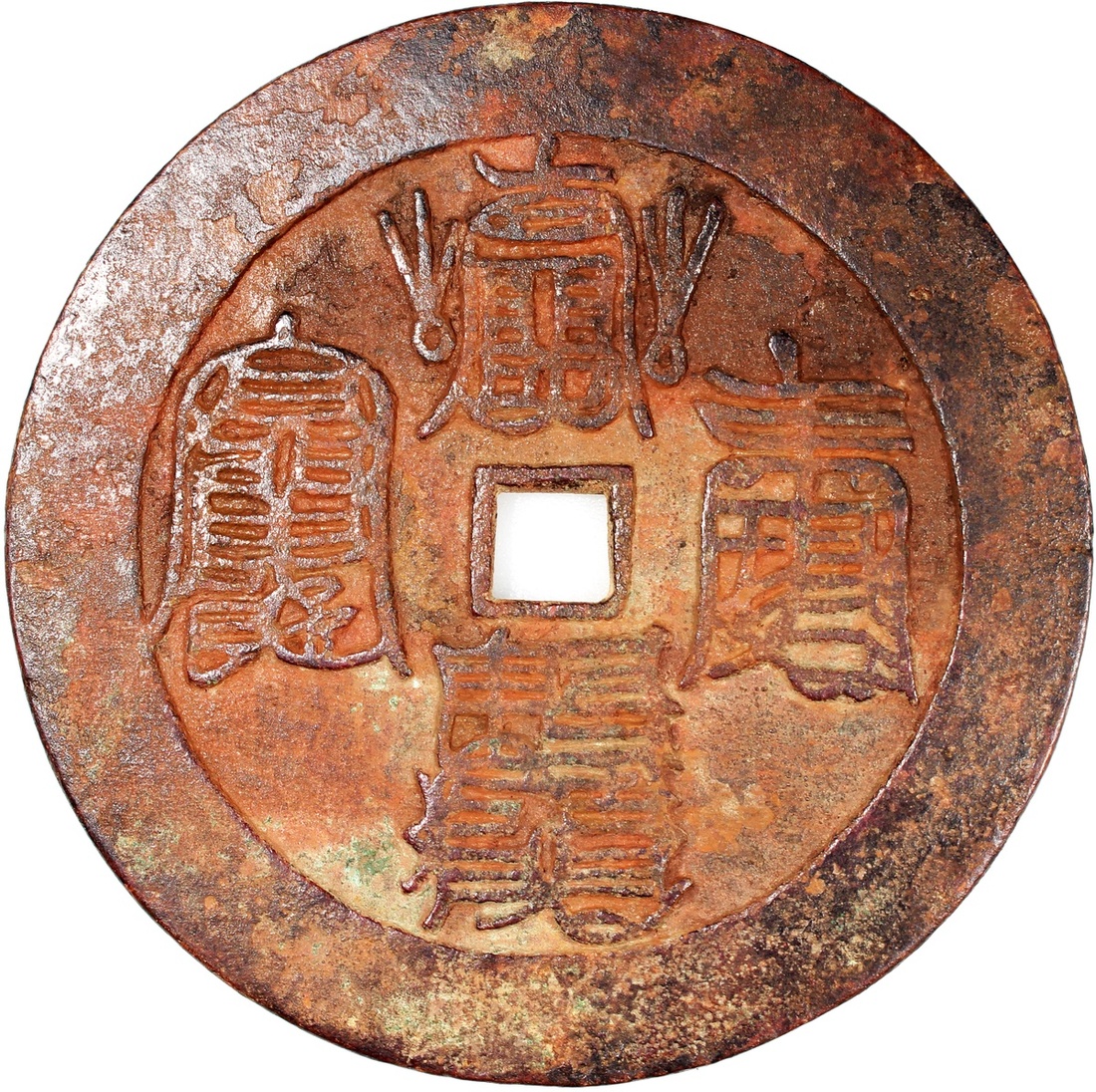 福壽康寧方穿花錢,背人物,明朝(公元1368–1644),77.8*2.6mm,重85.3g。體大,極美,極罕。