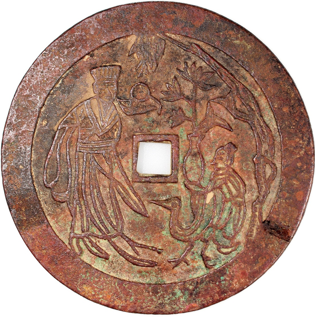 China: Ming Dynasty (1368-1644 CE), coin-shaped charm with square hole, obverse inscribed four Taoist characters that may read 'Fu shou kang ning', reverse showing a fairy god with attendant and crane, 77.8*2.6mm, 85.3g. Good size, extremely fine, extremely rare.