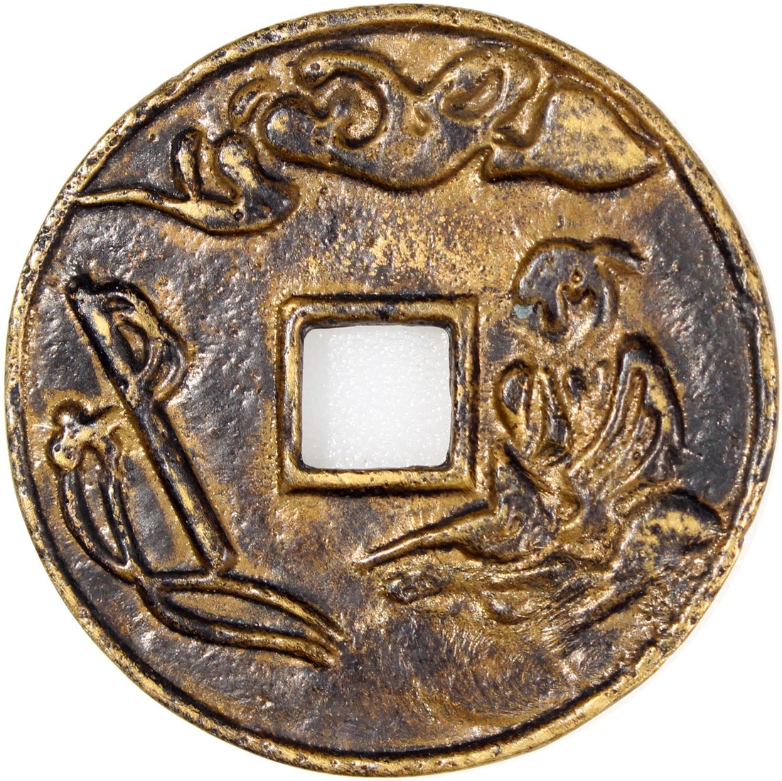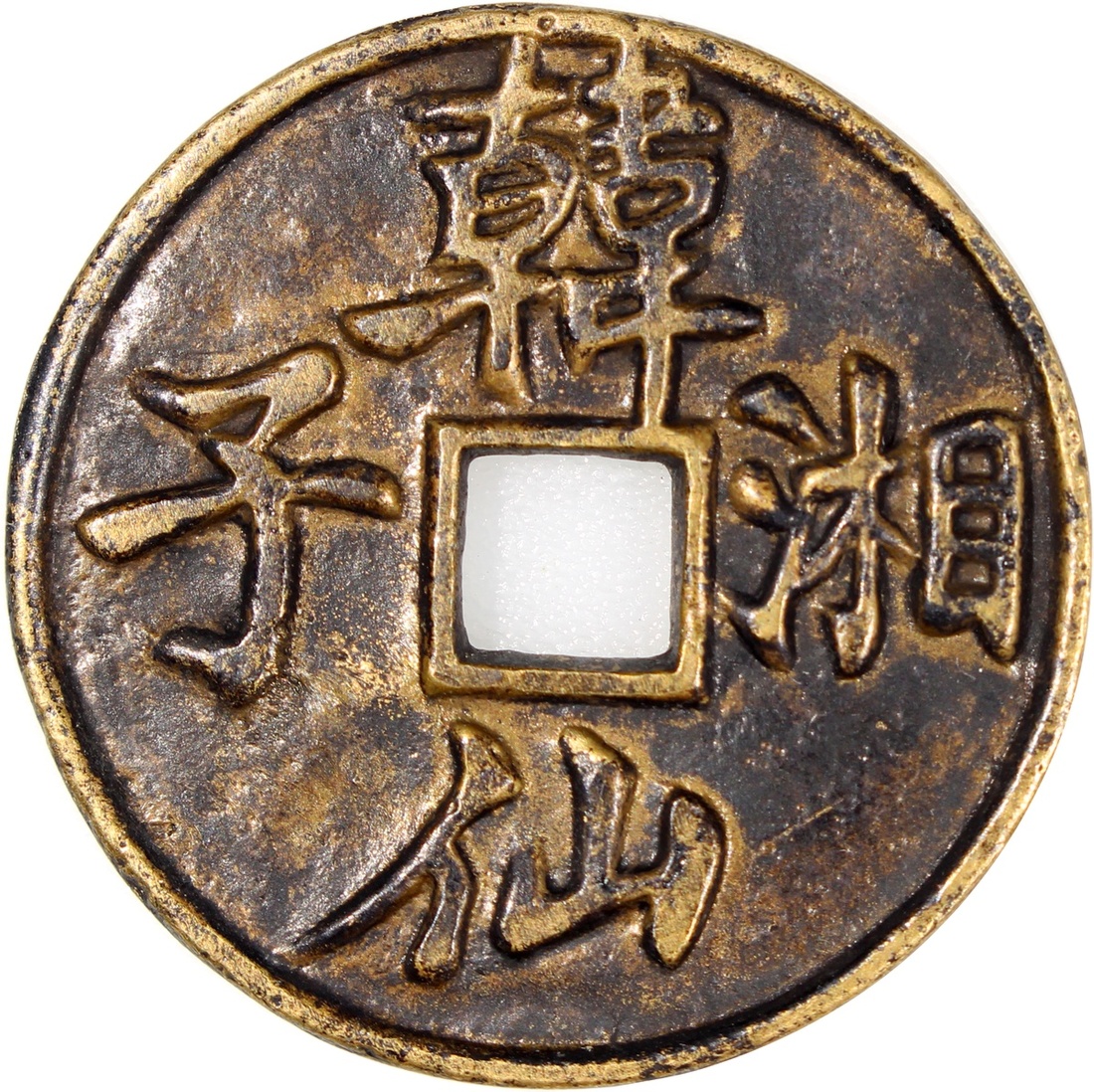 China: Qing Dynasty (1644-1911 CE), coin-shaped charm with square central hole, obverse inscribed 'Han xian xiang zi', reverse showing fairy god with flute, 32.9*2.2mm, 9.6g. Rare for square hole on this type.