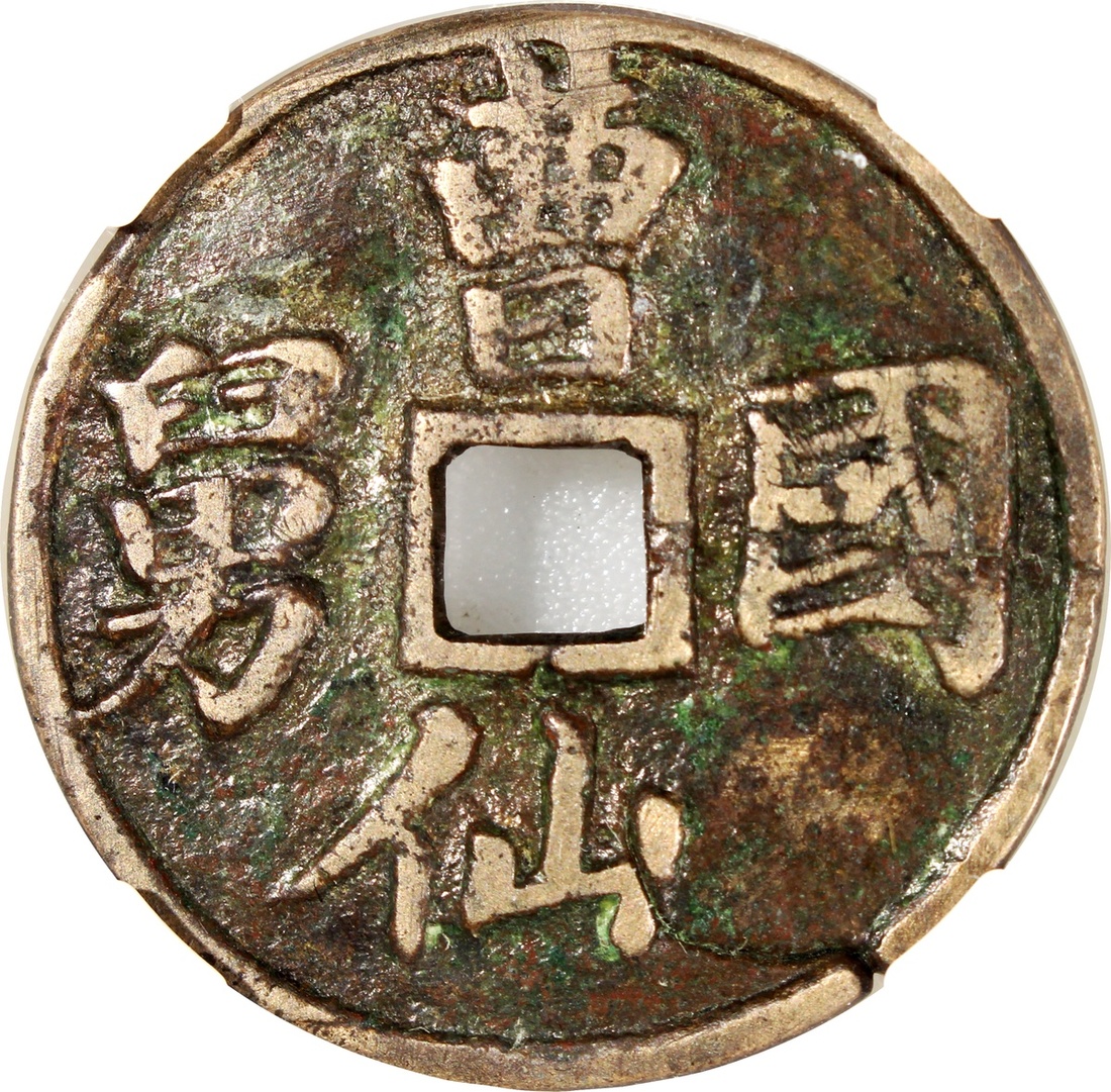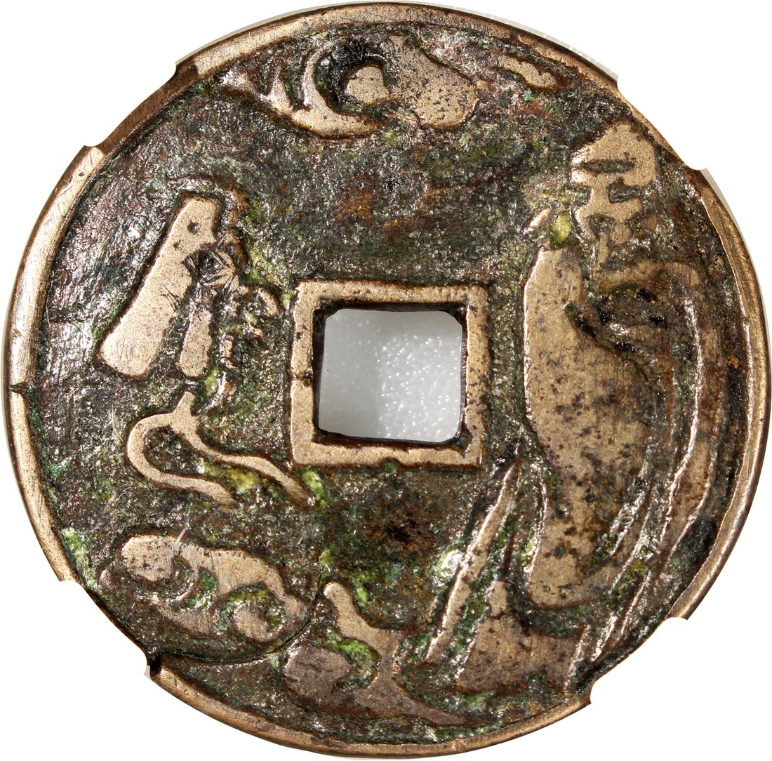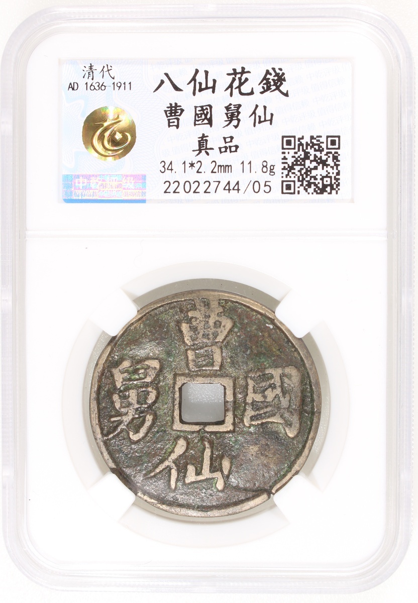 China: Qing Dynasty (1644-1911 CE), coin-shaped charm with square central hole, obverse inscribed 'Cao xian guo jiu', reverse showing fairy god with musical instrument, 34.1*2.2mm, 11.8g, Zhong Qian Genuine. Rare for square hole on this type.