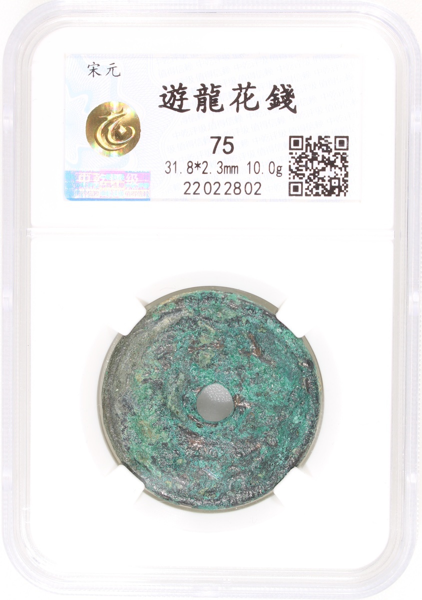 單龍圓穿花錢,素背,宋元(公元960–1368)時期,31.8*2.3mm,重10.0g,中乾75。