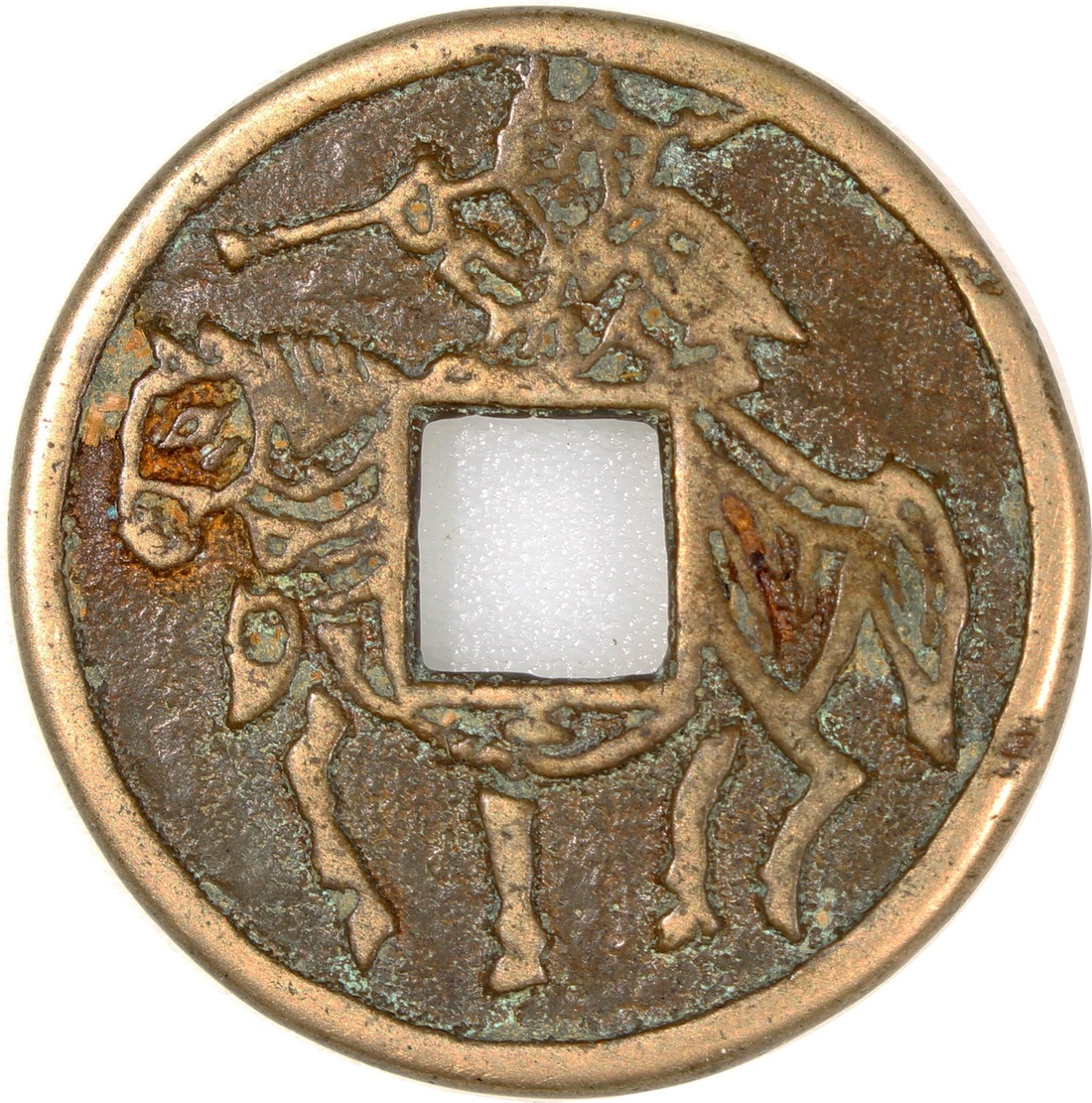 China: Song-Yuan Dynasty (960-1368 CE), coin-shaped charm with square central hole, obverse inscribed 'Yan jiang le yi', reverse showing man on horse, 32.1*2.5mm, 11.5g. Very fine.