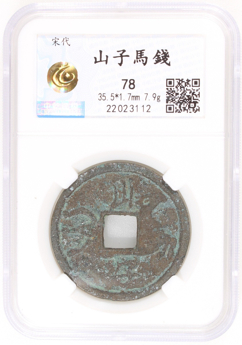 China: Song Dynasty (960-1279 CE), coin-shaped charm with square central hole, obverse inscribed 'Shan zi' with horse, reverse plain, 35.5*1.7mm, 7.9g, Zhong Qian 78. Extremely fine, large size.