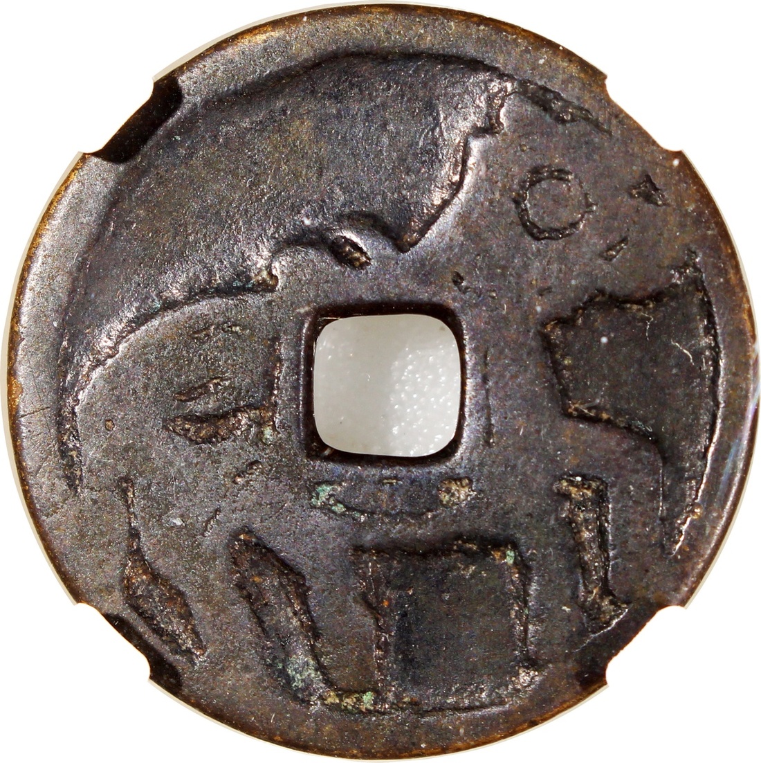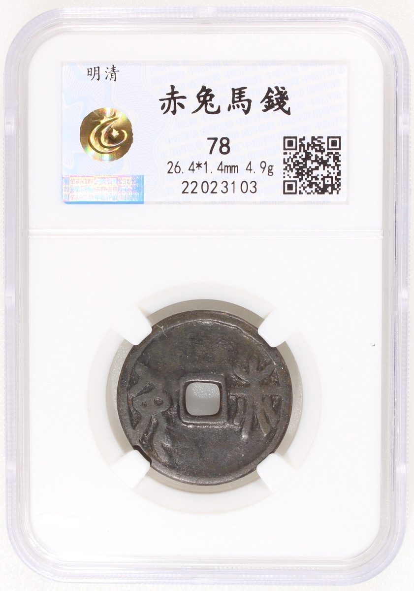赤兔方穿馬錢,背馬,宋元(公元960–1368)時期,26.4*1.4mm,重4.9g,中乾82,標籤明清。好品。