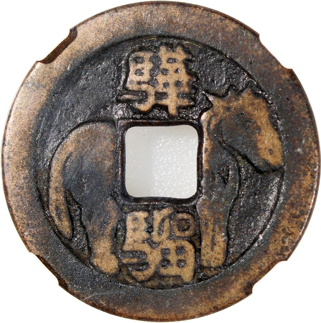 China: Song Dynasty (960-1279 CE), coin-shaped charm with square central hole, obverse inscribed 'Hua liu' showing horse, reverse plain, 27.7*1.6mm, 6.9g, Zhong Qian 80. Extremely fine.