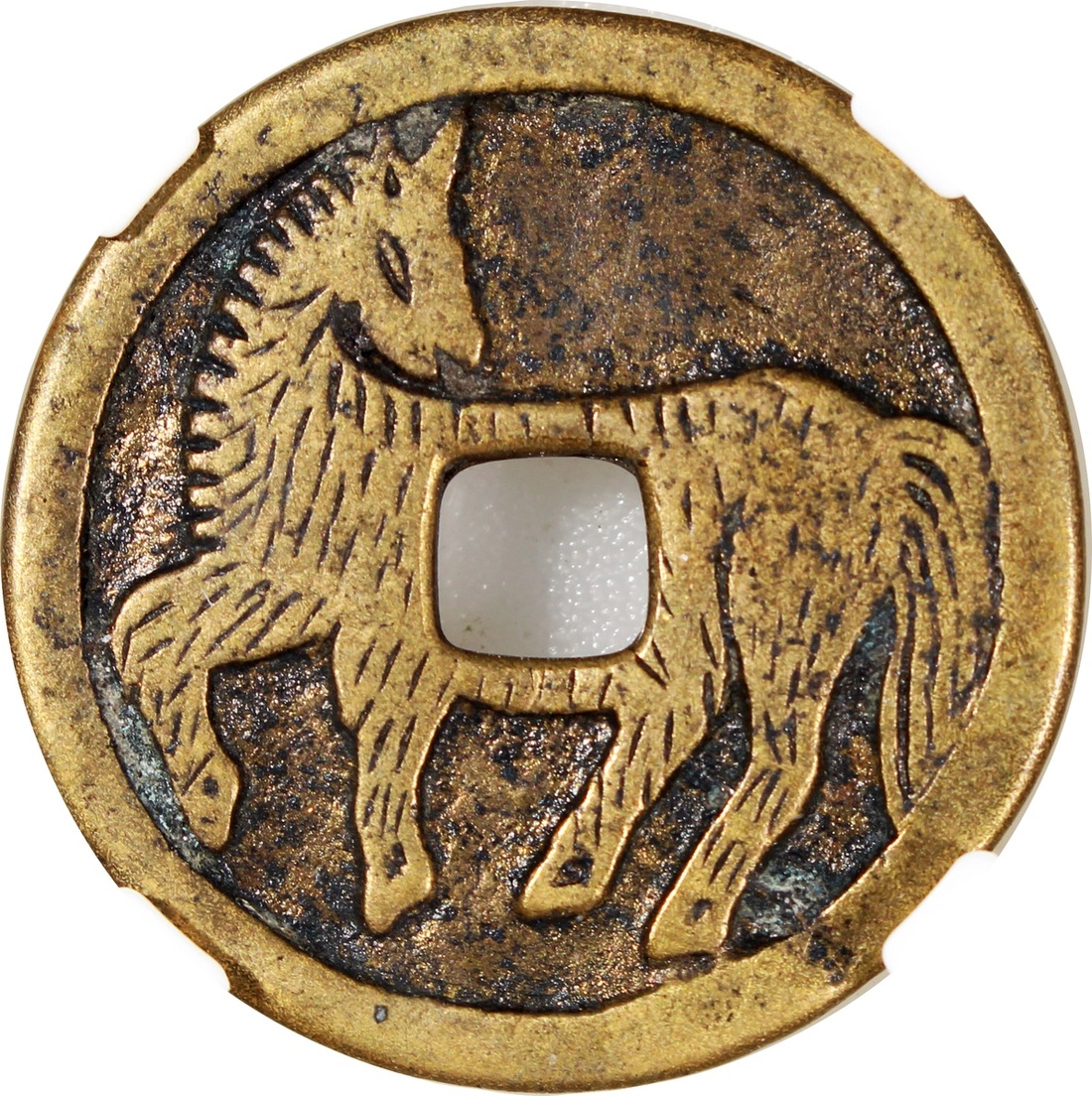 China: Yuan-Ming Dynasty (1271-1644 CE), coin-shaped charm with square central hole, obverse inscribed 'Qu huang', reverse showing horse, 28.7*2.1mm, 7.1g, Zhong Qian Genuine, labelled as Qing Dynasty. Extremely fine.