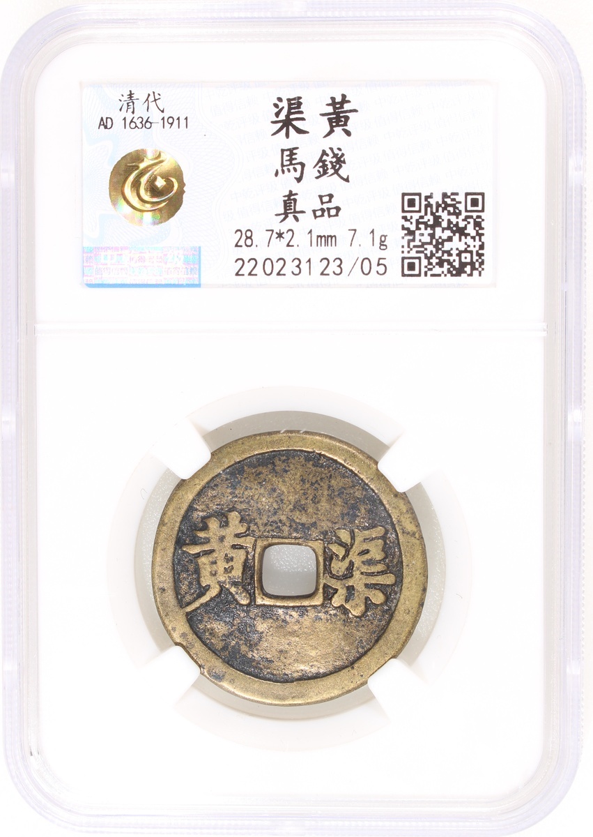 渠黃方穿馬錢,背馬,元明(公元1271–1644)時期,28.7*2.1mm,重7.1g,中乾真品,標籤清朝。極美。